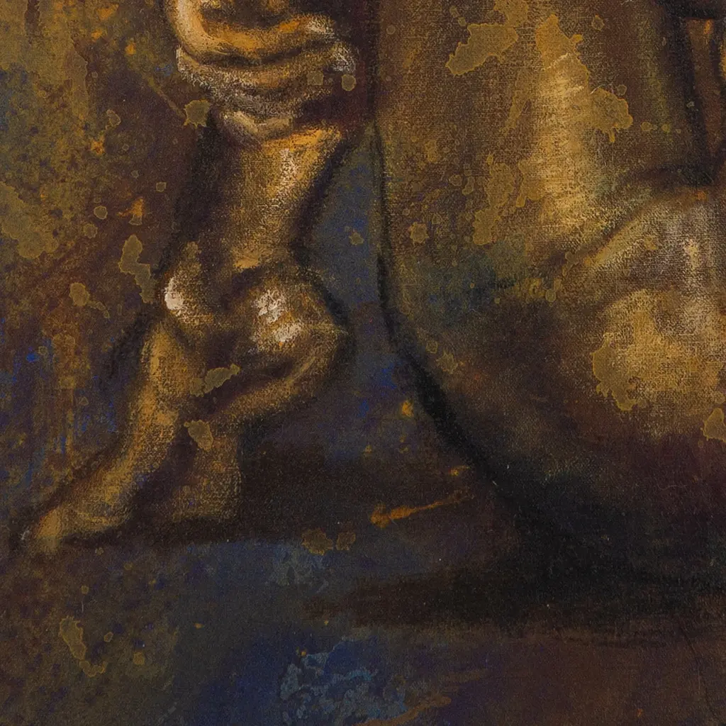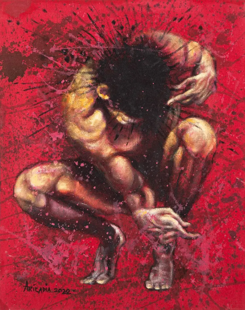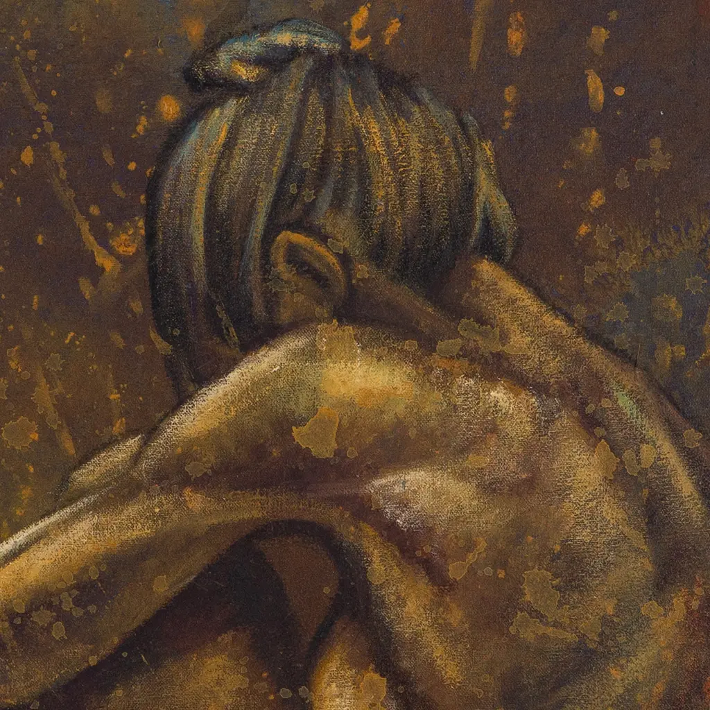 Capturing a private moment, Aricadia in Bali paints this beautiful original portrait of a nude young woman hugging her knees to her chest. He works in oils and acrylics on canvas to create the artwork.