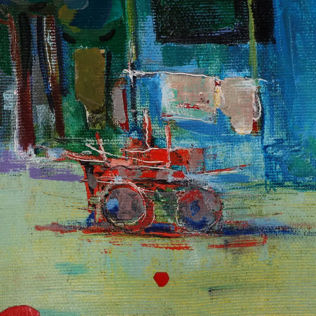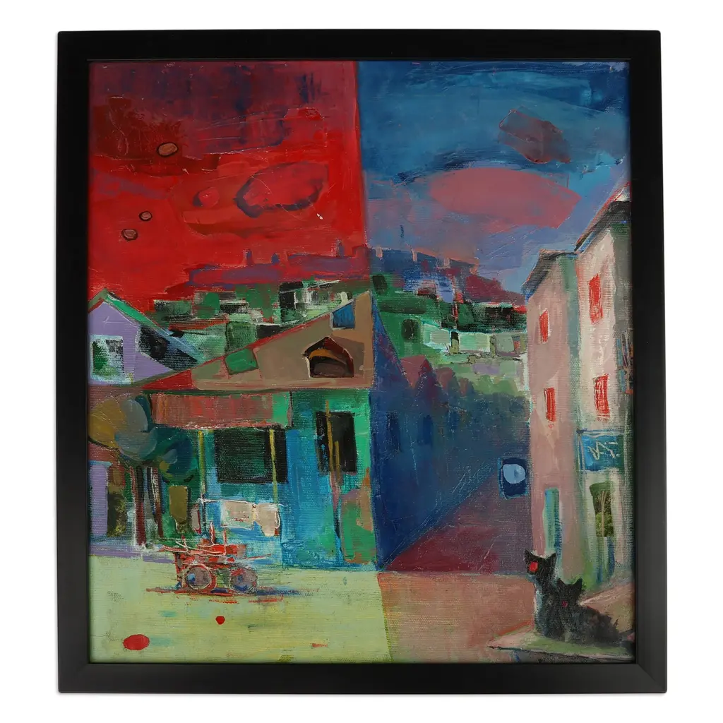 Expressionist Urbanscape Oil And Paper Painting With Frame- Cats