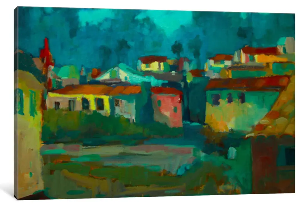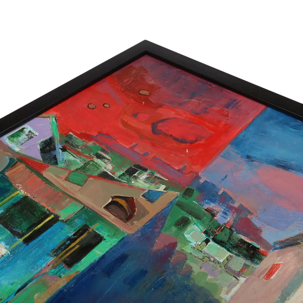 Cats embody Armenia's spirit for knowledge and freedom in this expressionist composition by Vahagn Ghazaryan. Paper and oil merge in each detail, bringing an urban scene to life, where twilight and sunset meet in the sky. Adorned with a minimalist acrylic frame in black, the piece evokes the region's contemporary arts.