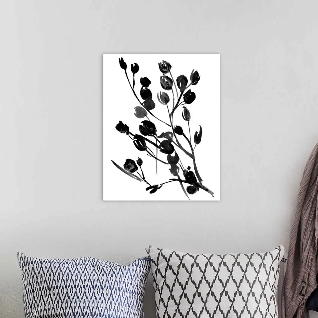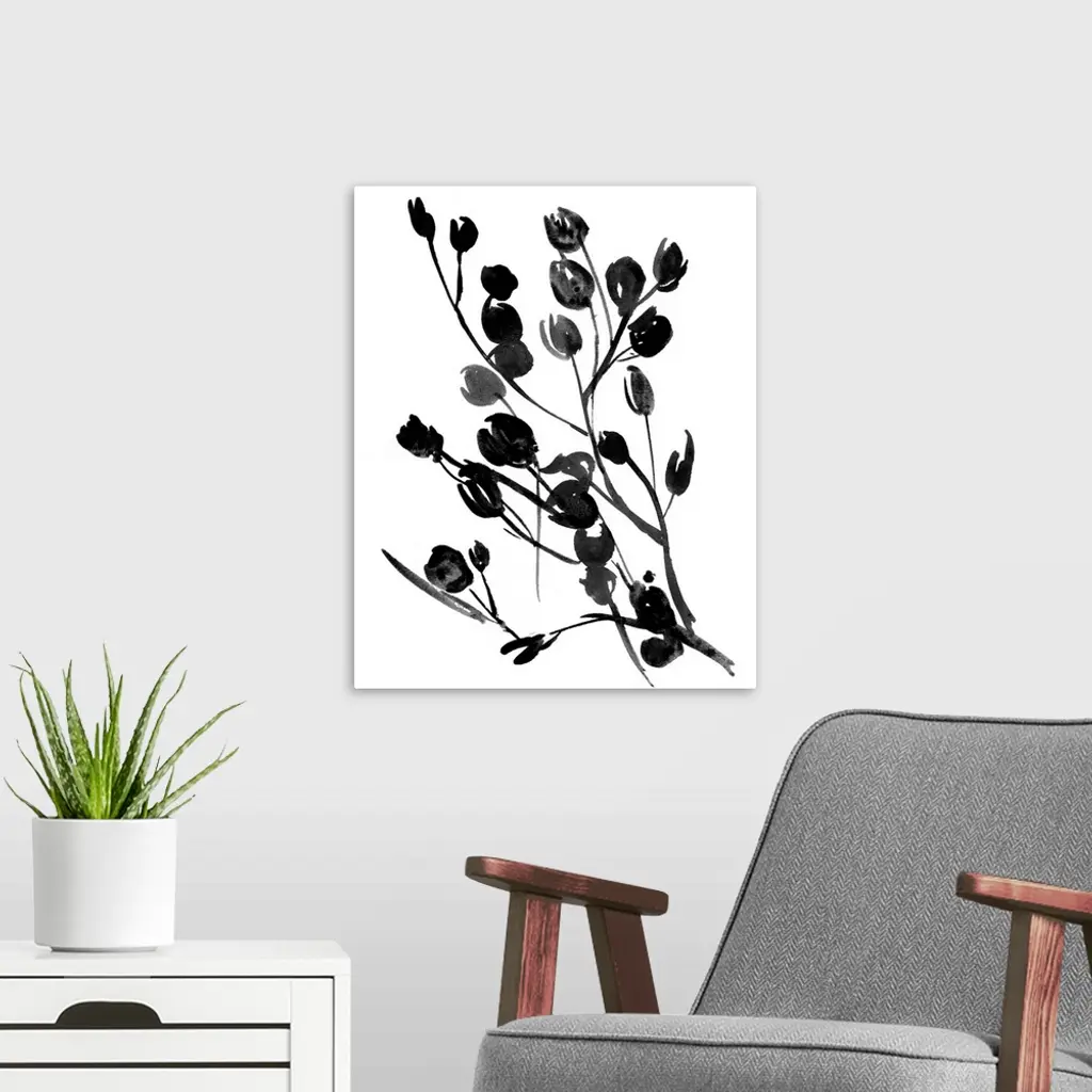 Flowers drawn in black ink centered over a white background in this contemporary artwork.
