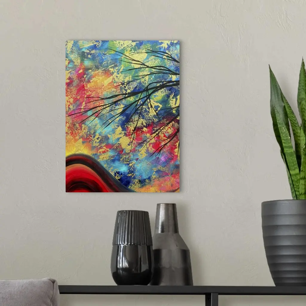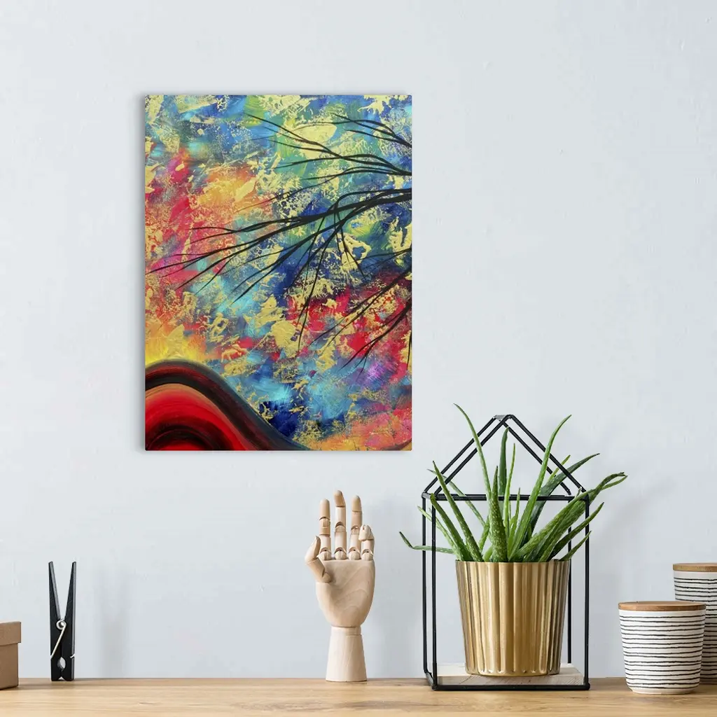 A whimsical landscape painting with a gold metallic textured overlay that makes the bold colors pop on canvas.