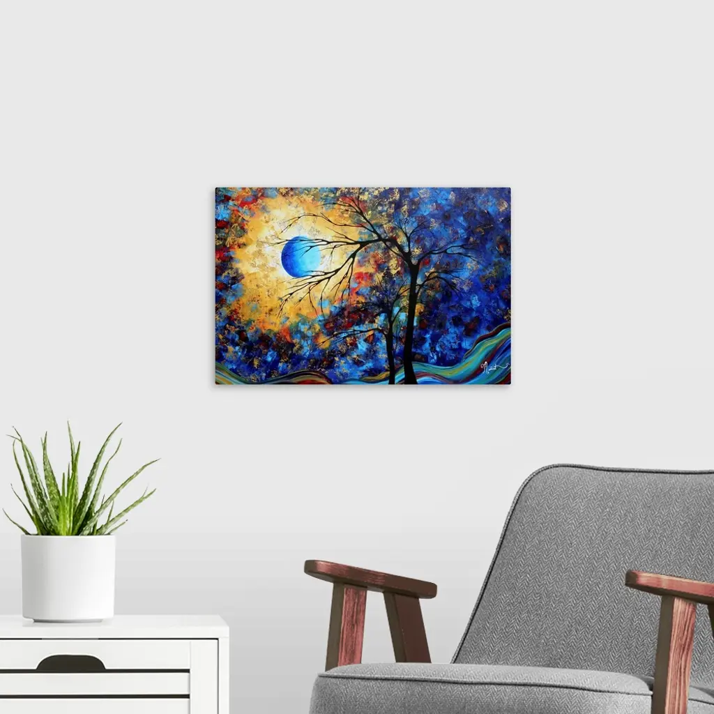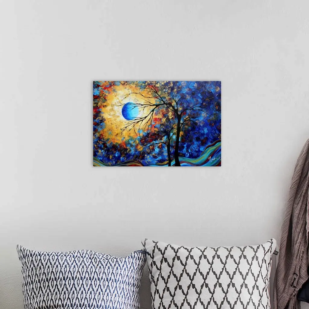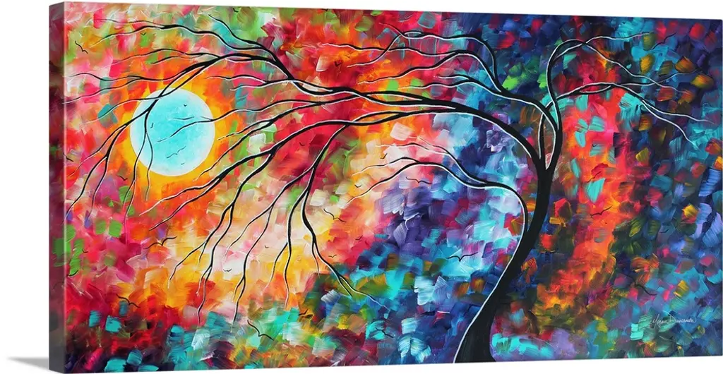 Horizontal, large contemporary painting of the moon brightly lighting the night sky in patches of color. Two bare tree silhouettes rise in the foreground.