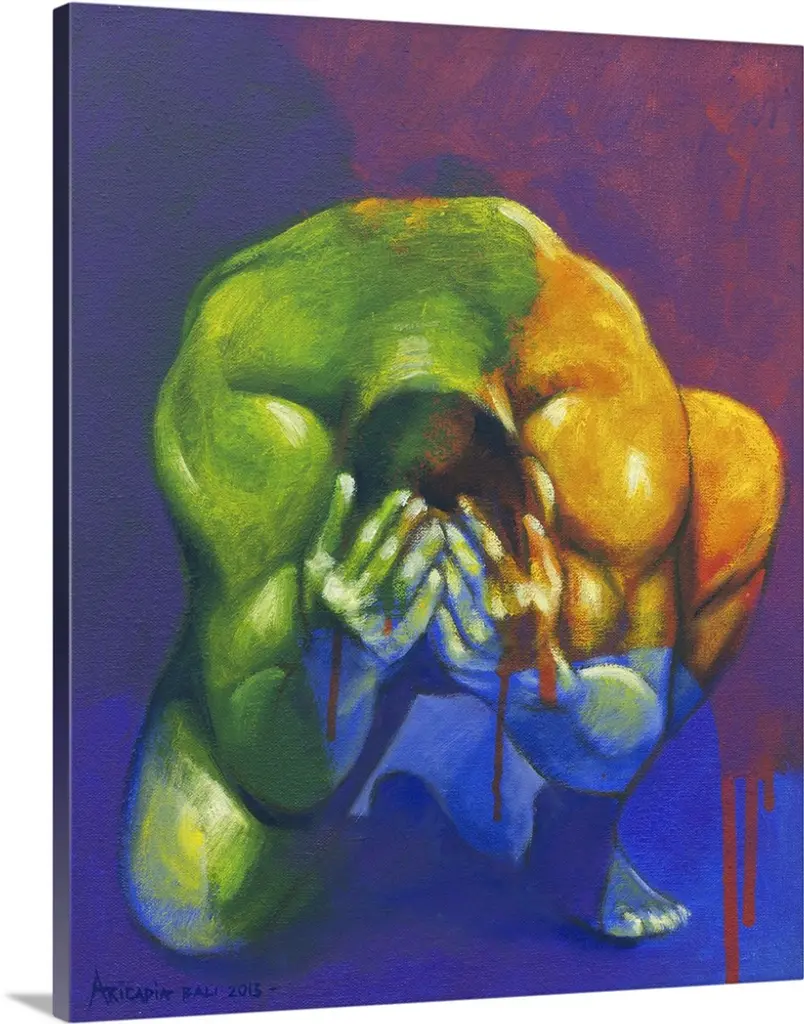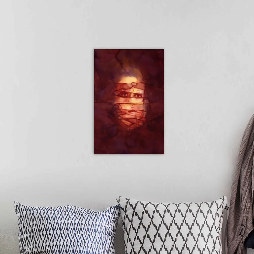 Contemporary abstract painting of a face covered by overlapping fingers.