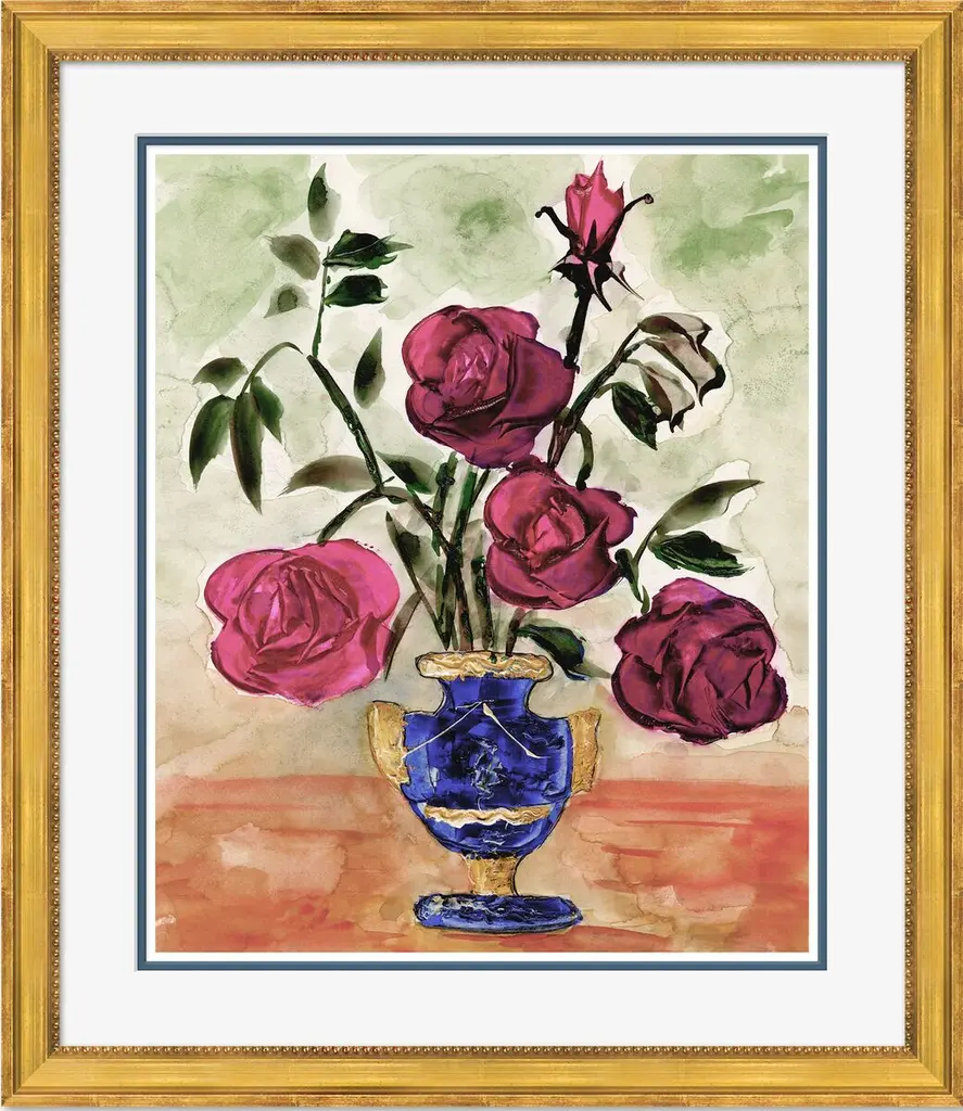 This still life of flowers in a vase manages to be both stately and whimsical. Meticulously reproduced on archival paper, it arrives matted, framed, and ready to hang. Delightful on its own, it can be hung with other still lifes from this series to create a vibrant gallery wall.