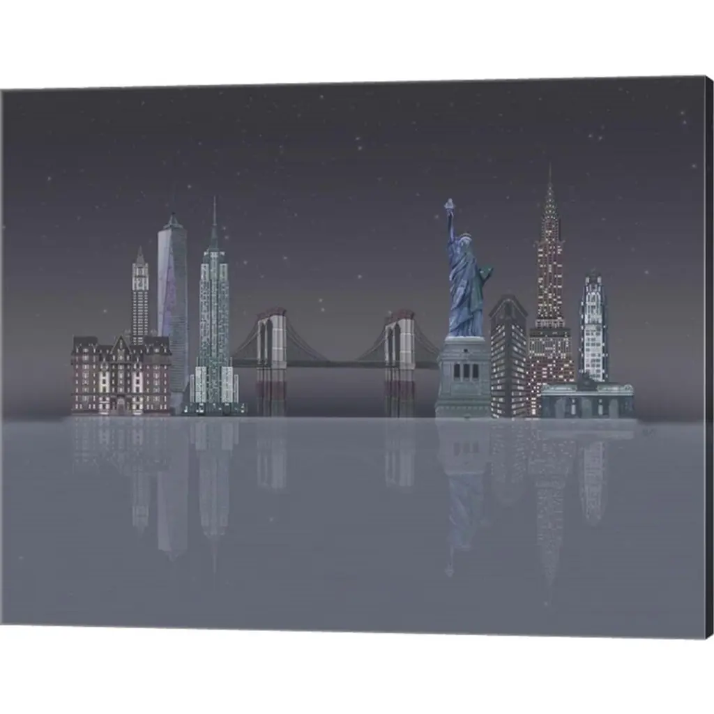 New York Skyline Night Reflections by Fab Funky is a high quality piece of canvas artwork. The finished size of this piece is 20" X 16", and it has a depth 0.75". There is a UV protective coating over the entire image, and it is ready to hang on your wall with no hardware required.