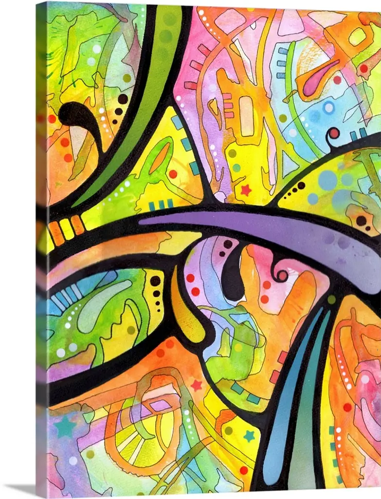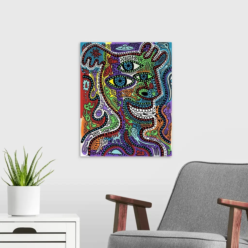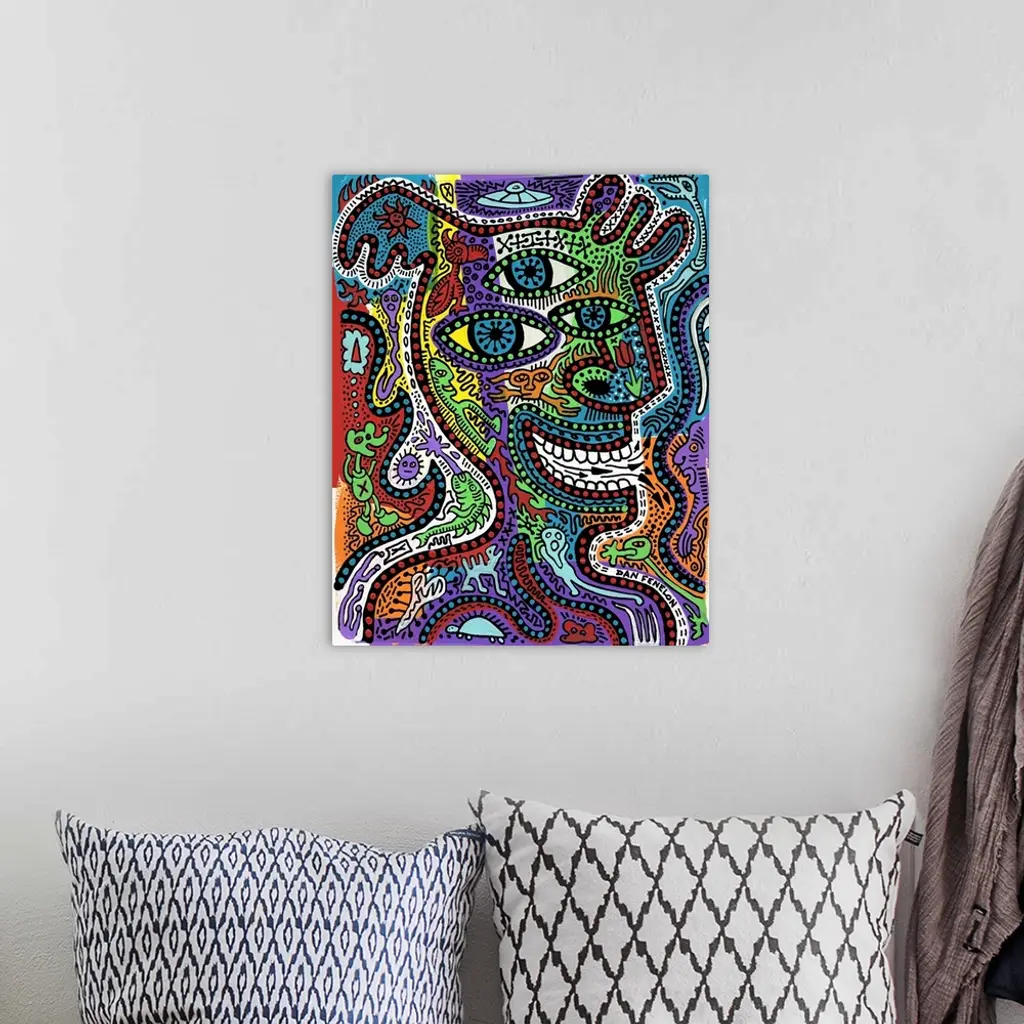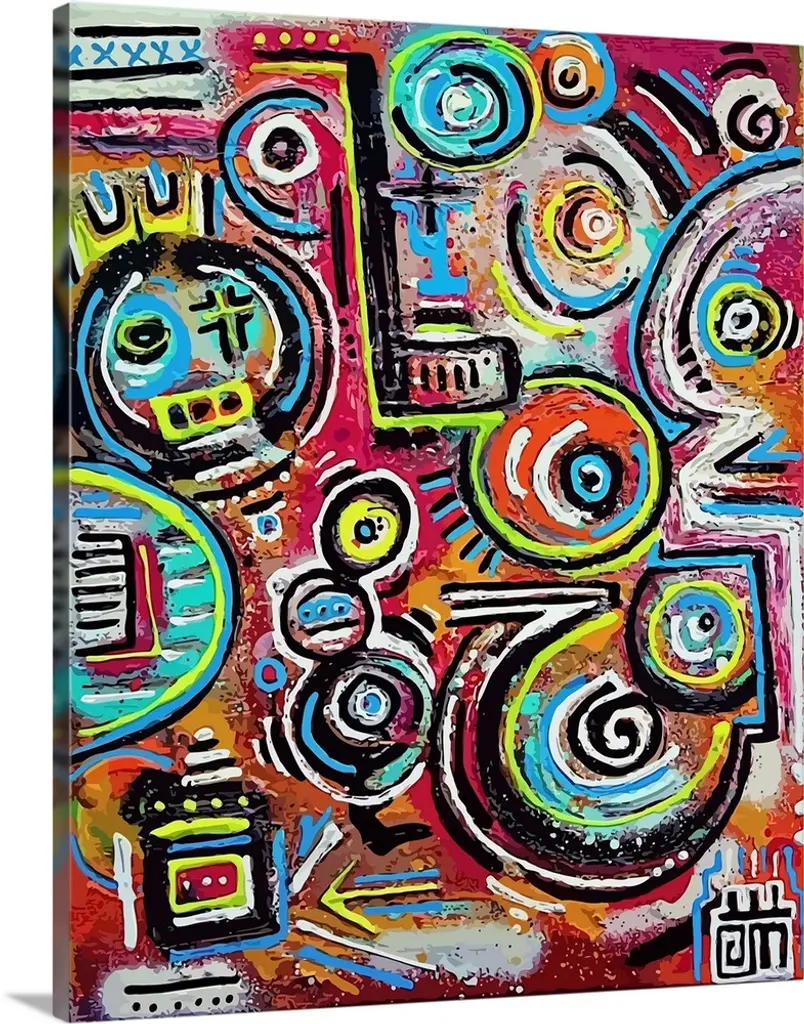 Contemporary aboriginal inspired artwork with bright colors and intricate detail.
