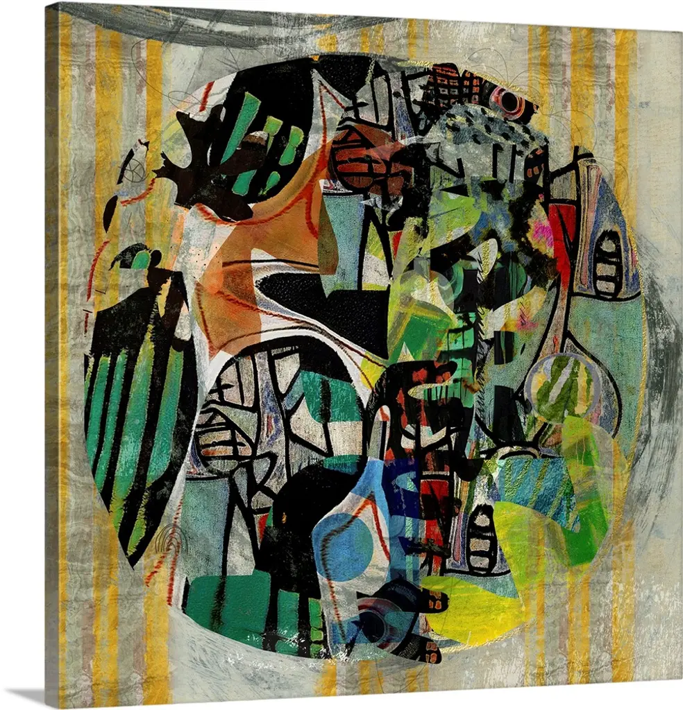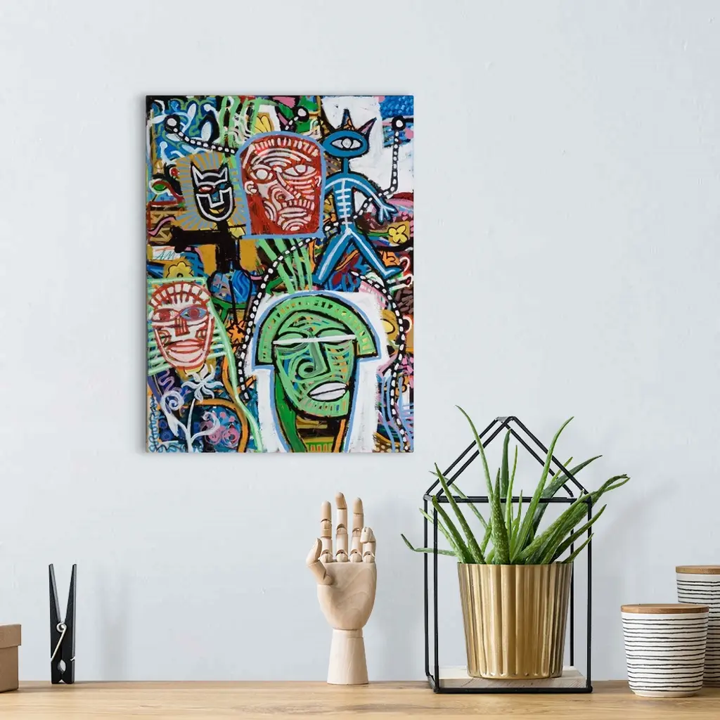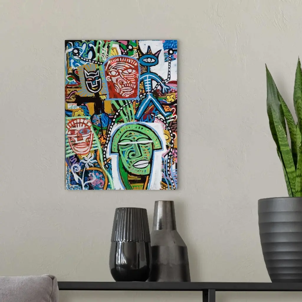 Contemporary abstract painting of masks and faces with distorted forms in elaborate colors and patterns.