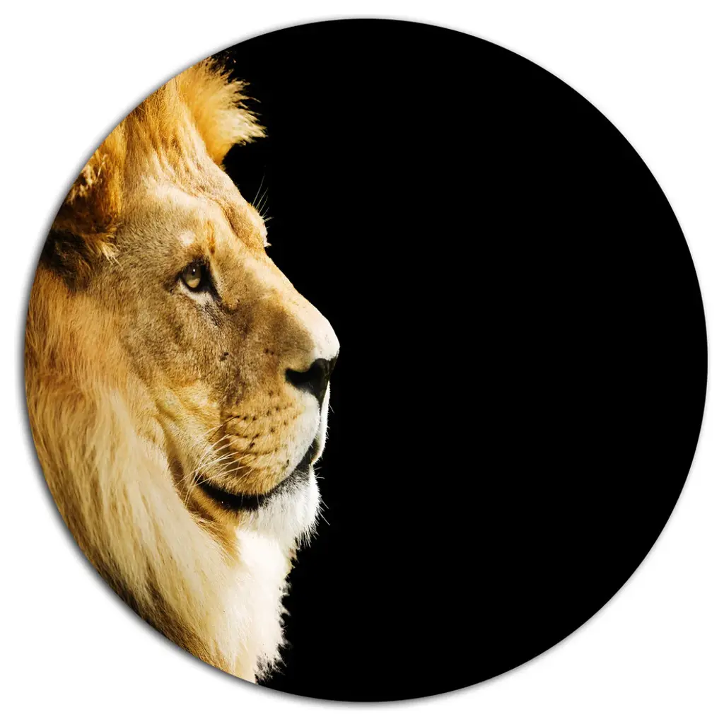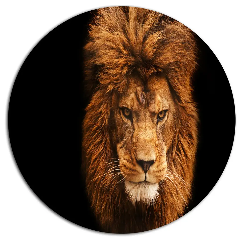 Bring Contemporary Abstraction to your home with this large Circle Metal wall art. This Face of Male Lion on Black Metal Artwork makes it the focal point of any room or office. - White Gloss Coating ensures colors are extra vibrant with light reflection.- Aluminum grade Sheet Metal with 1 inch mounting frame on the back giving the illusion that the artwork is floating on the wall..- Mounting Brackets are included along with instructions.- High Quality Digital images are created directly into a glossy aluminum panel producing a stunning and captivating print into the glossy finish of the metal.- Water, Fire and Scratch resistant HD Aluminum panels.- Looks better than any photo paper and guaranteed to last at least 20 years- Easy to clean with a microfiber cloth. Colors are far superior to regular Canvas Art. - Easy to Hang