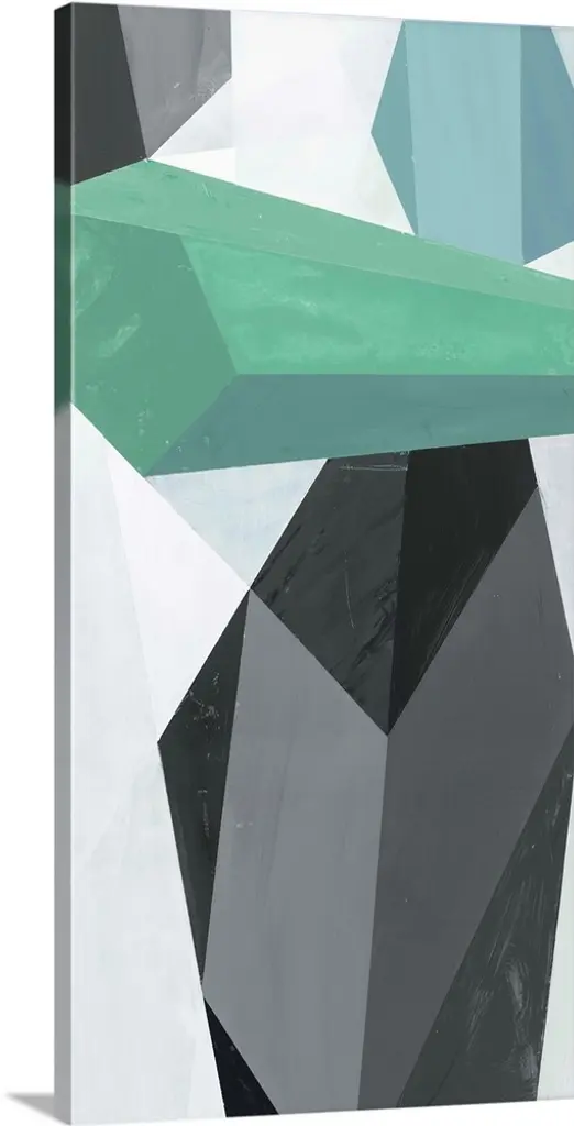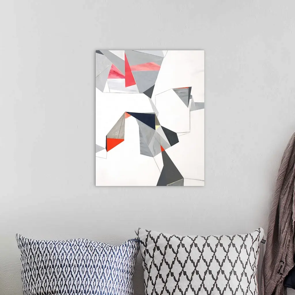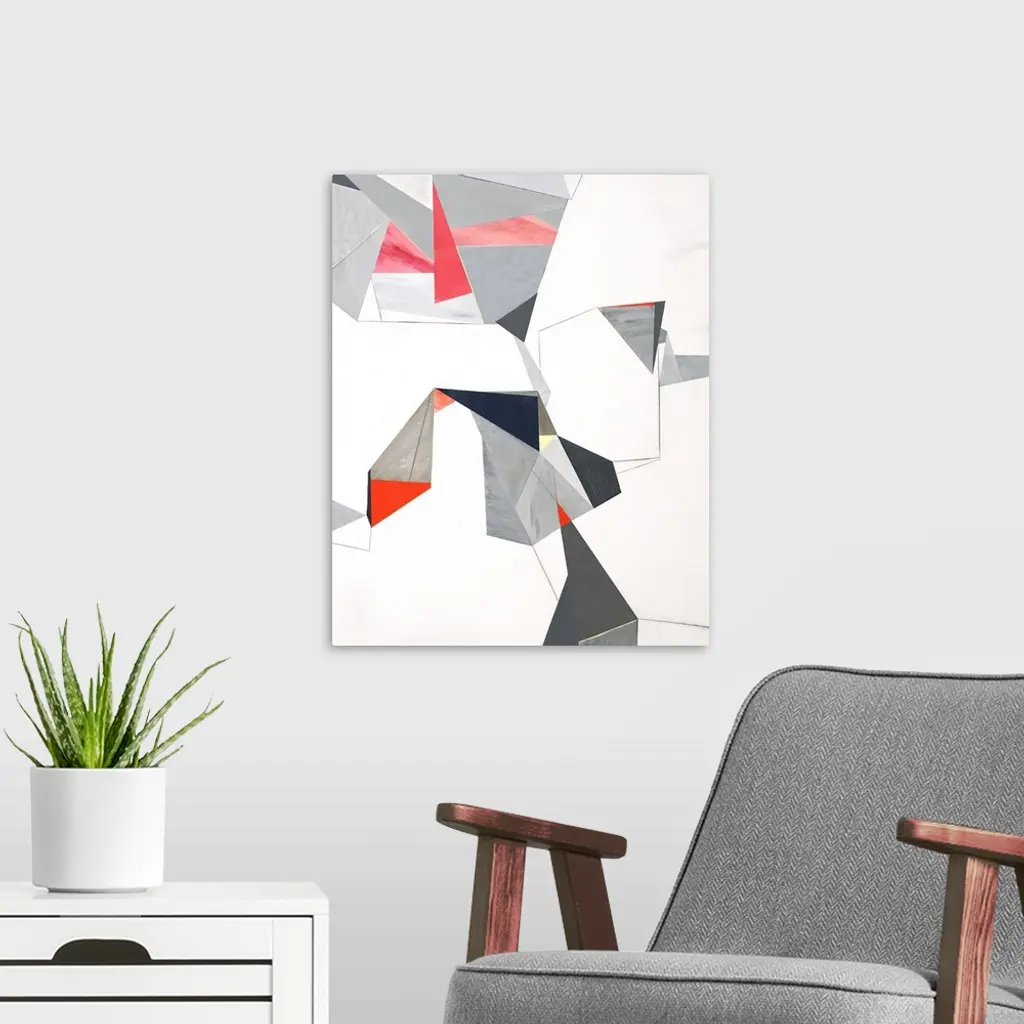 Geometric abstract painting with triangular shapes creating lines and movement throughout.
