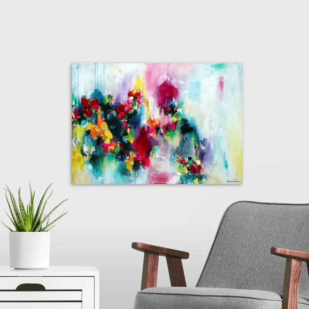 Contemporary abstract painting in vivid red, yellow, and green shades.