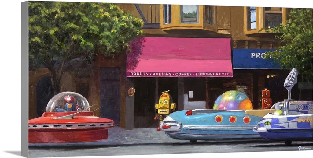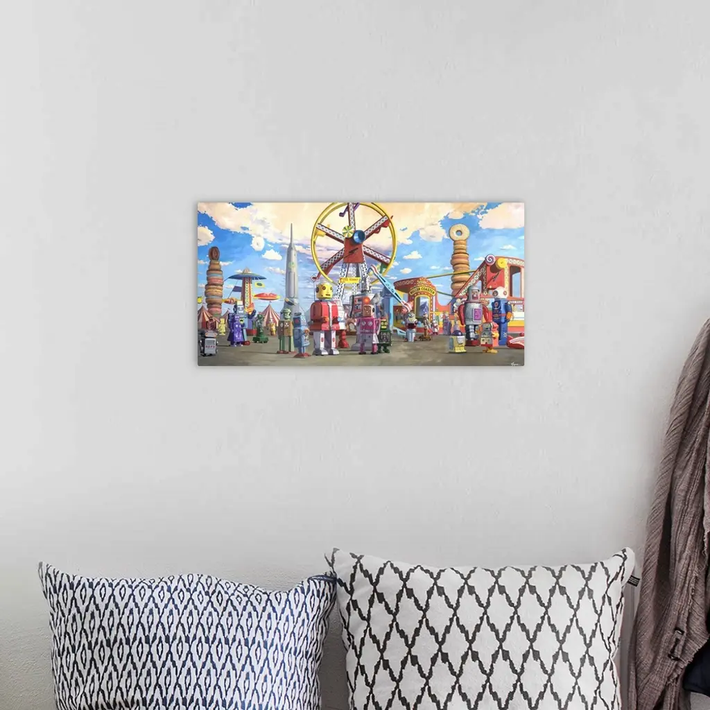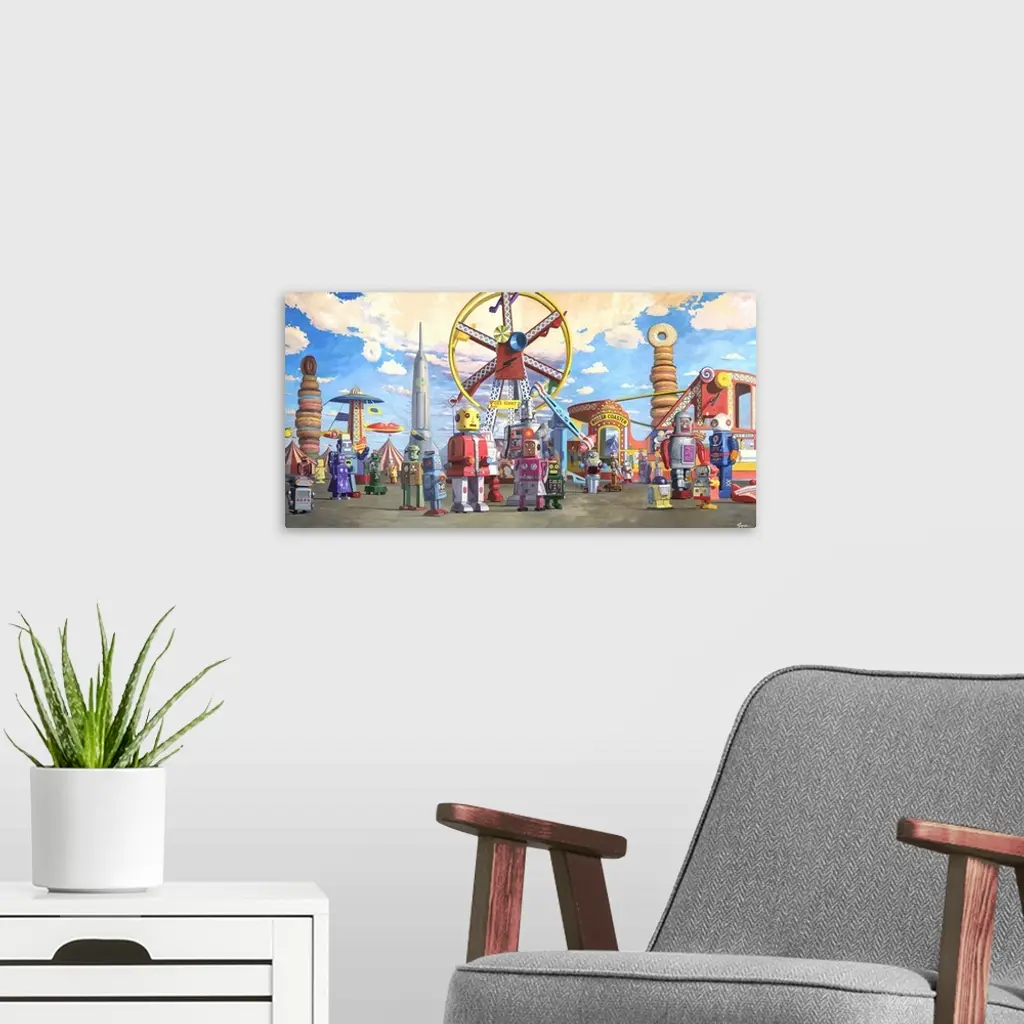 A contemporary painting of retro toy robots enjoying a day a theme park.