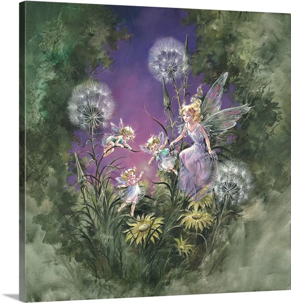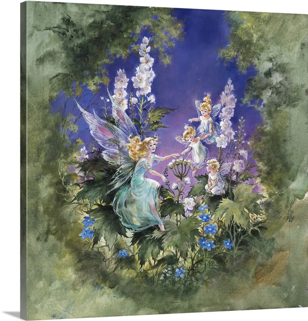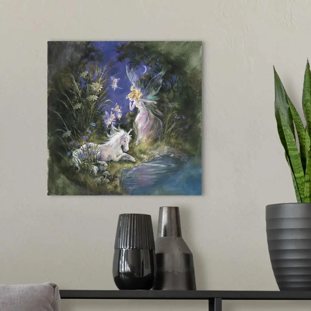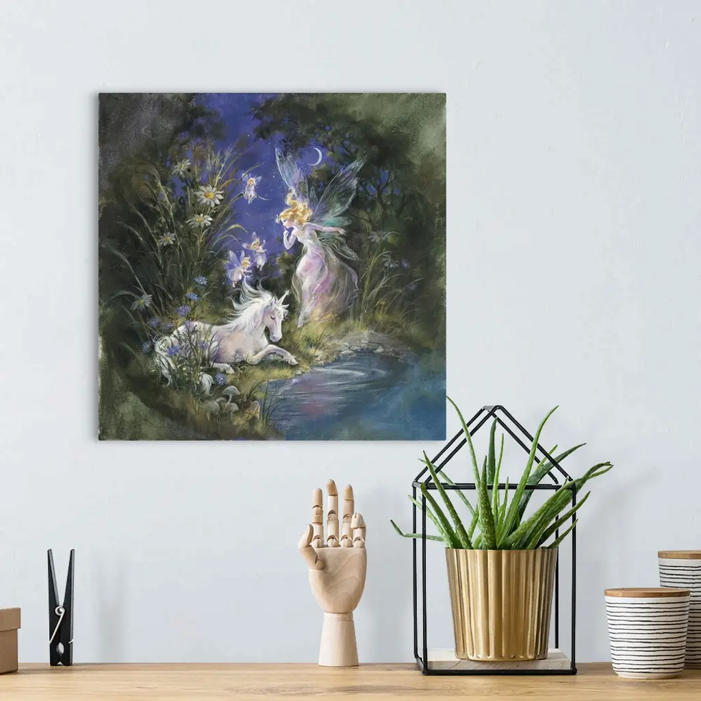 Whimsical contemporary fantasy artwork of fairies and unicorns in an enchanted garden.