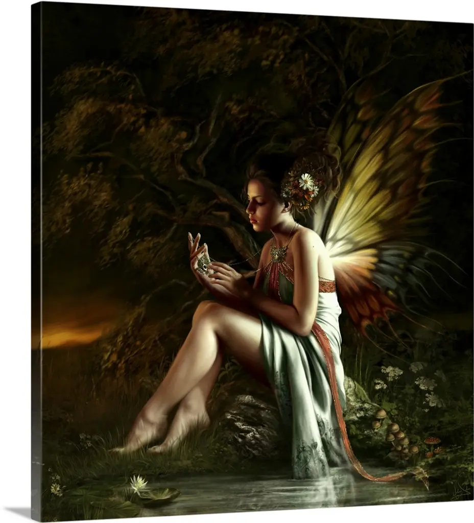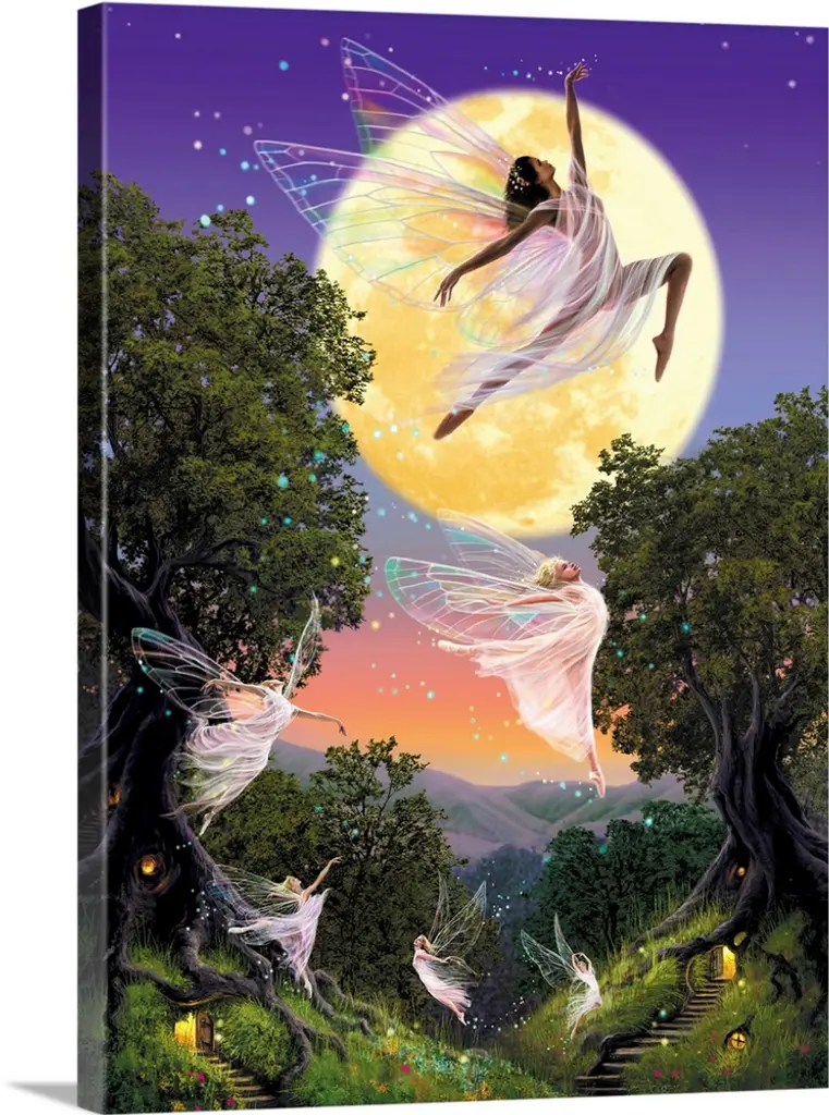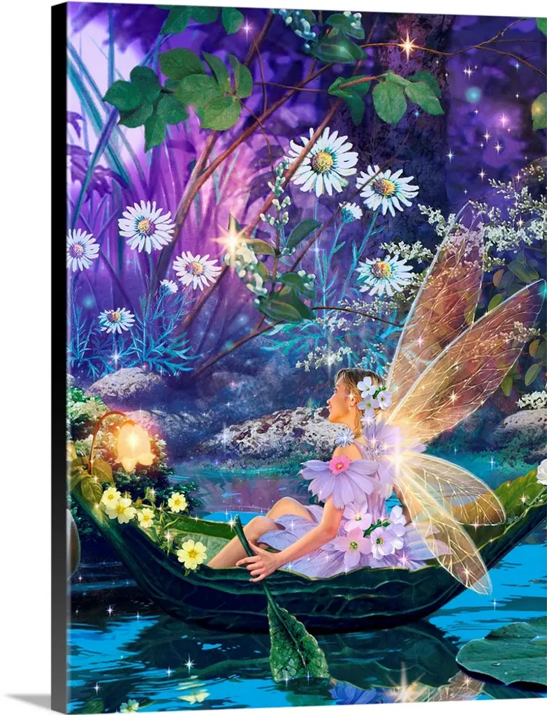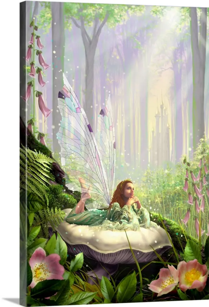 Whimsical contemporary fantasy artwork of fairies and unicorns in an enchanted garden.