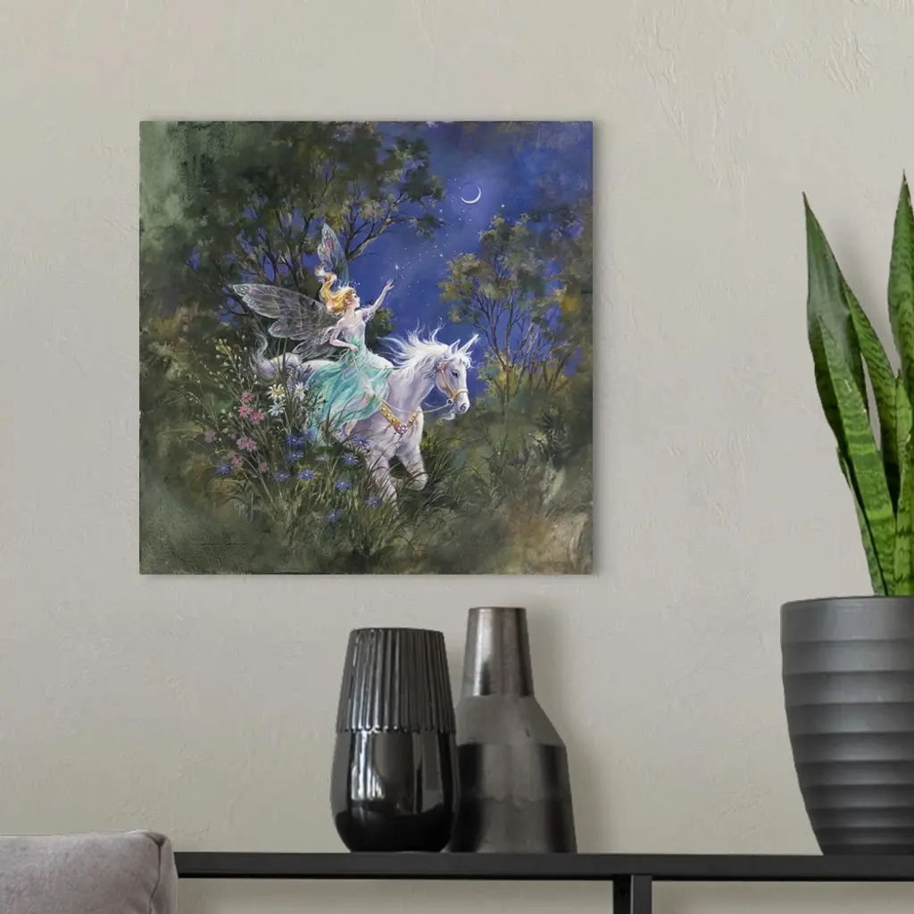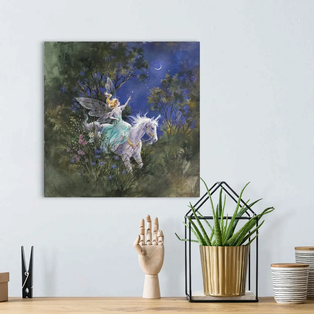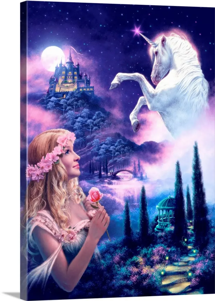 Whimsical contemporary fantasy artwork of fairies and unicorns in an enchanted garden.