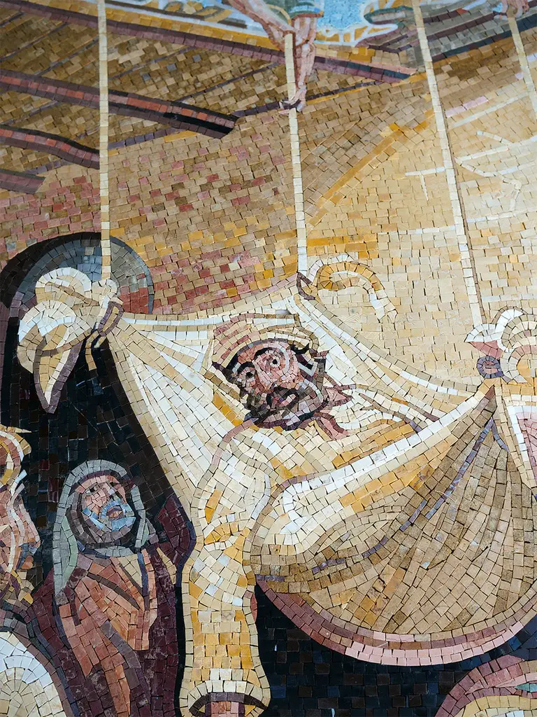 This handmade mosaic masterpiece captures the powerful biblical story of the paralyzed man being lowered through the roof to receive healing. Crafted with exquisite marble tesserae, this artwork vividly portrays the expressions of faith, hope, and divine intervention. The intricate shading and warm earthy tones create a lifelike depth, while the detailed architectural elements and expressive figures bring the narrative to life. A stunning example of religious mosaic art, this piece is perfect for churches, chapels, and sacred spaces, serving as a timeless symbol of perseverance and faith. With its meticulous craftsmanship and historic storytelling, this mosaic wall art embodies the beauty and significance of traditional Christian artistry.