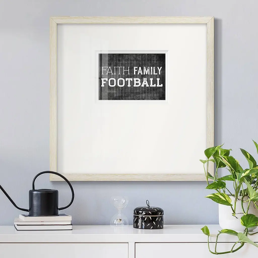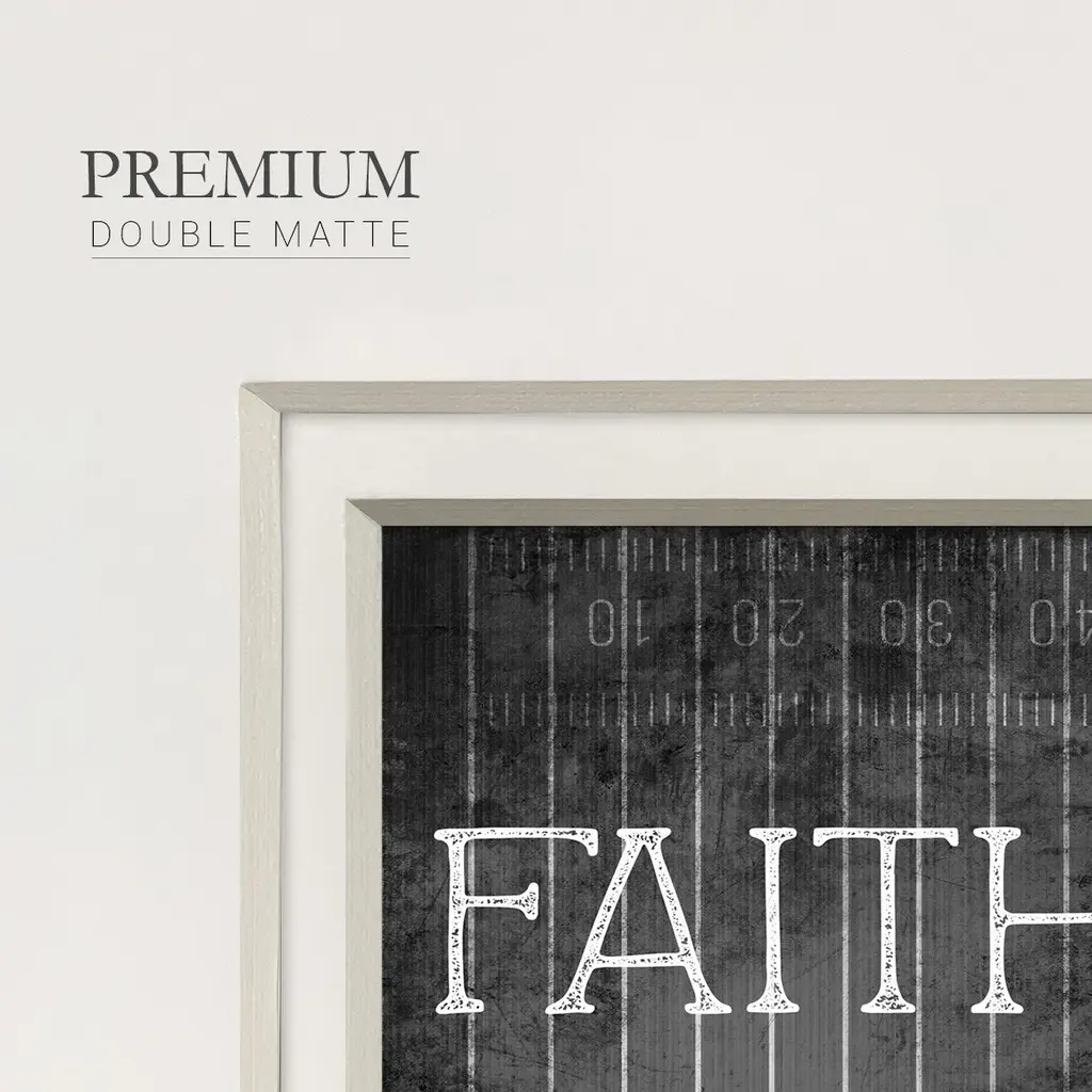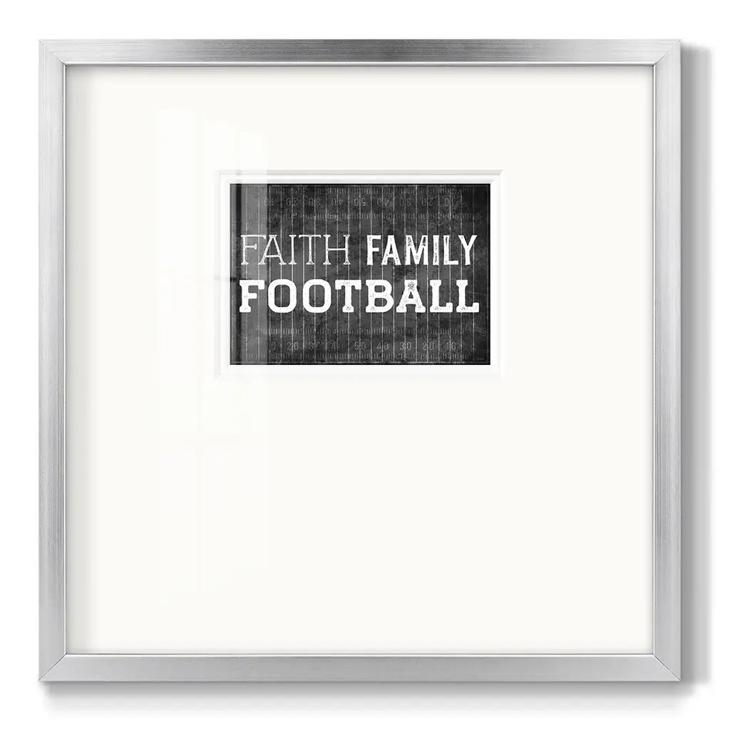 Faith Family FootballPremium Framed Print A framed cold pressed paper print featuring superior double matting and quality frame. 2 SIZES AVAILABLE 16''X16''' - Overall Size 20''X20''' - Overall Size Each piece is made to order. Each piece comes with hanging hardware. Made in the USA Ready to Hang Giclee Paper Print Plexiglass Beveled Matt Board Double Matte Board