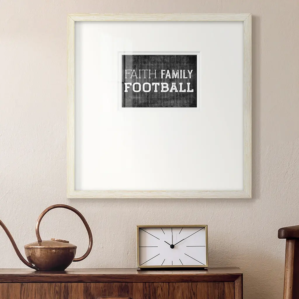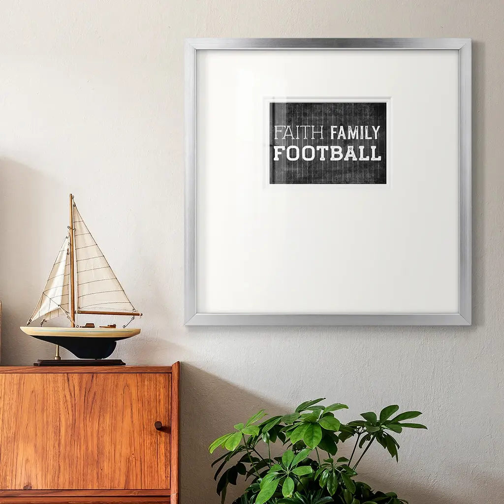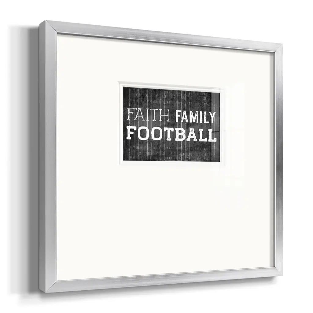 Faith Family FootballPremium Framed Print A framed cold pressed paper print featuring superior double matting and quality frame. 2 SIZES AVAILABLE 16''X16''' - Overall Size 20''X20''' - Overall Size Each piece is made to order. Each piece comes with hanging hardware. Made in the USA Ready to Hang Giclee Paper Print Plexiglass Beveled Matt Board Double Matte Board