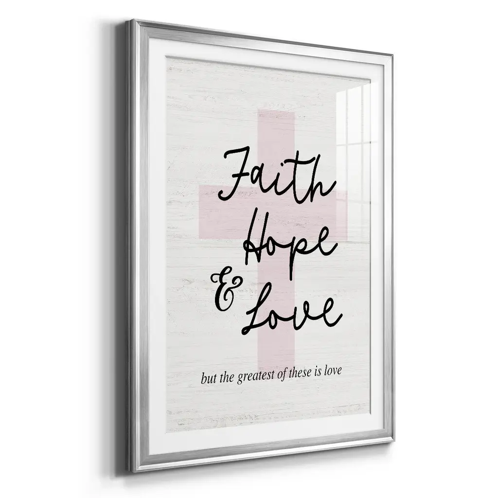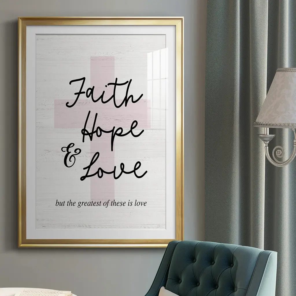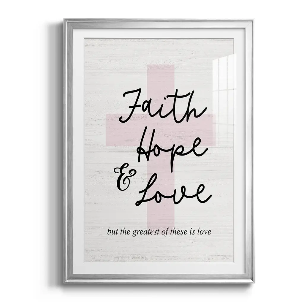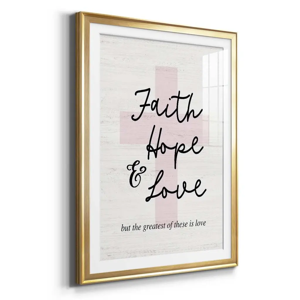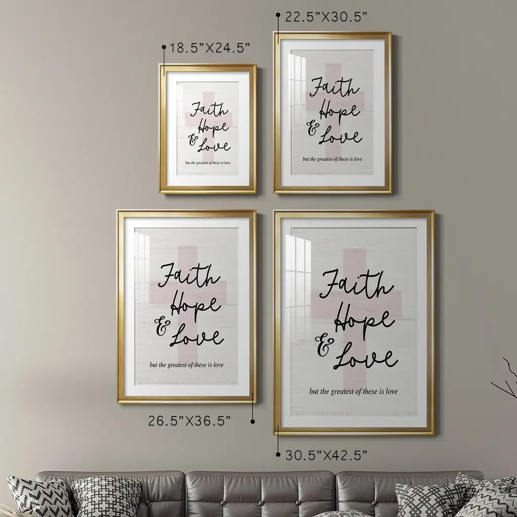 Faith Hope and Love Cross Premium Framed Print - Ready to Hang A Premium Framed Print created to last. Framed in distressed wood and available in an array of sizes and colors Featuring a beveled a solid wood stretcher bar, each piece comes ready to hand 4 SIZES AVAILABLE 30.5''X42.5'' - Overall Size 26.5'X36.5'' - Overall Size 22.5''x30.5'' - Overall Size 18.5''x24.5'' - Overall Size Each piece is made to order. Each piece comes with hanging hardware. Made in the USA Ready to Hang Giclee Paper Print Acrylic Glass Beveled Matt Board
