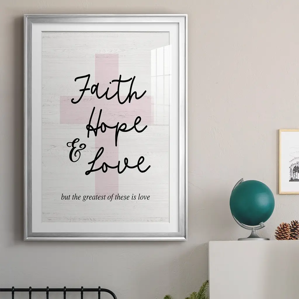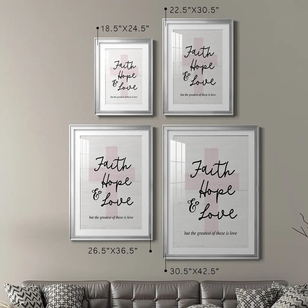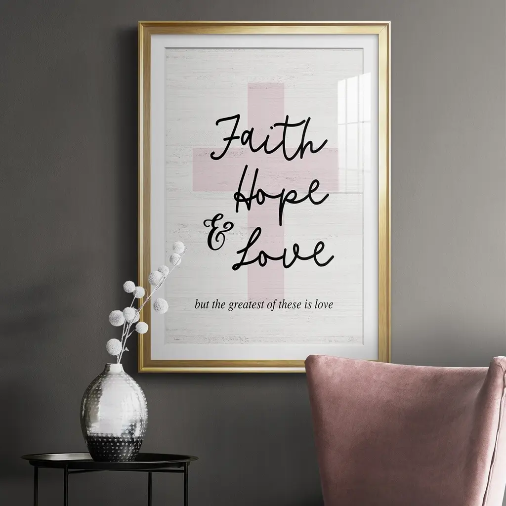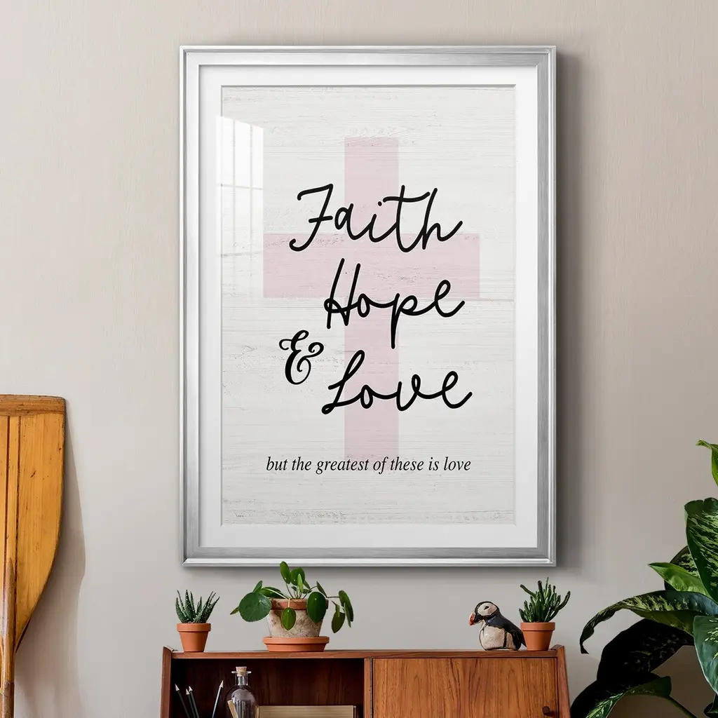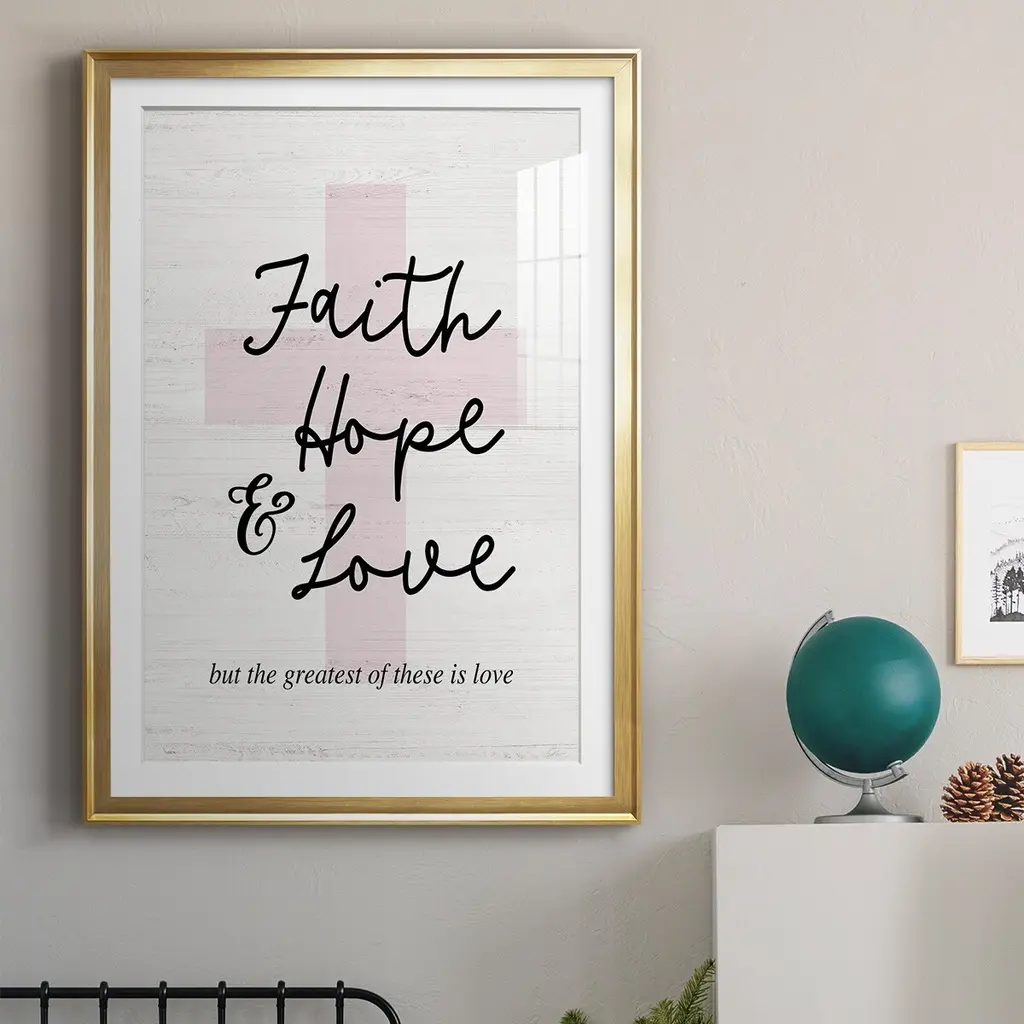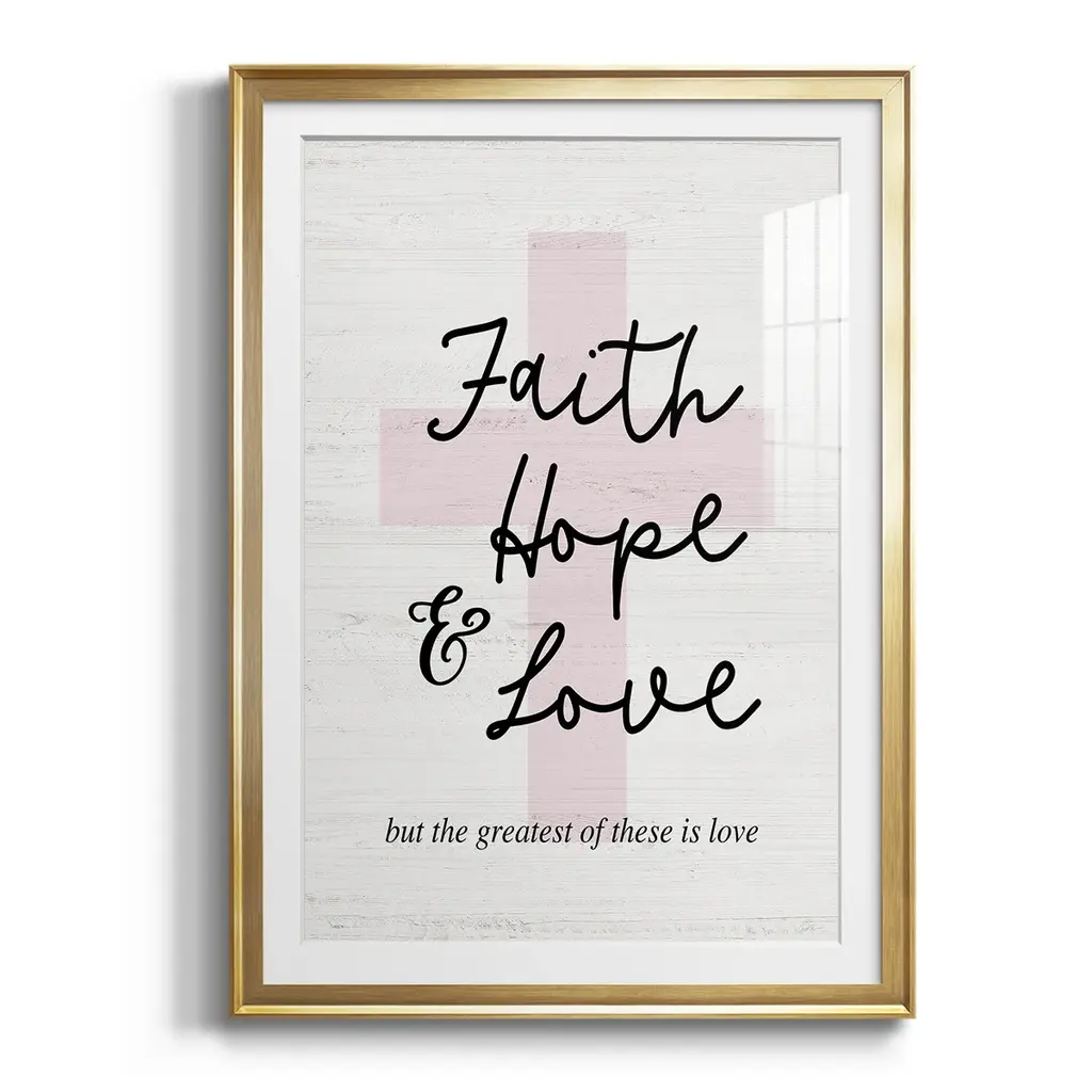 Faith Hope and Love Cross Premium Framed Print - Ready to Hang A Premium Framed Print created to last. Framed in distressed wood and available in an array of sizes and colors Featuring a beveled a solid wood stretcher bar, each piece comes ready to hand 4 SIZES AVAILABLE 30.5''X42.5'' - Overall Size 26.5'X36.5'' - Overall Size 22.5''x30.5'' - Overall Size 18.5''x24.5'' - Overall Size Each piece is made to order. Each piece comes with hanging hardware. Made in the USA Ready to Hang Giclee Paper Print Acrylic Glass Beveled Matt Board
