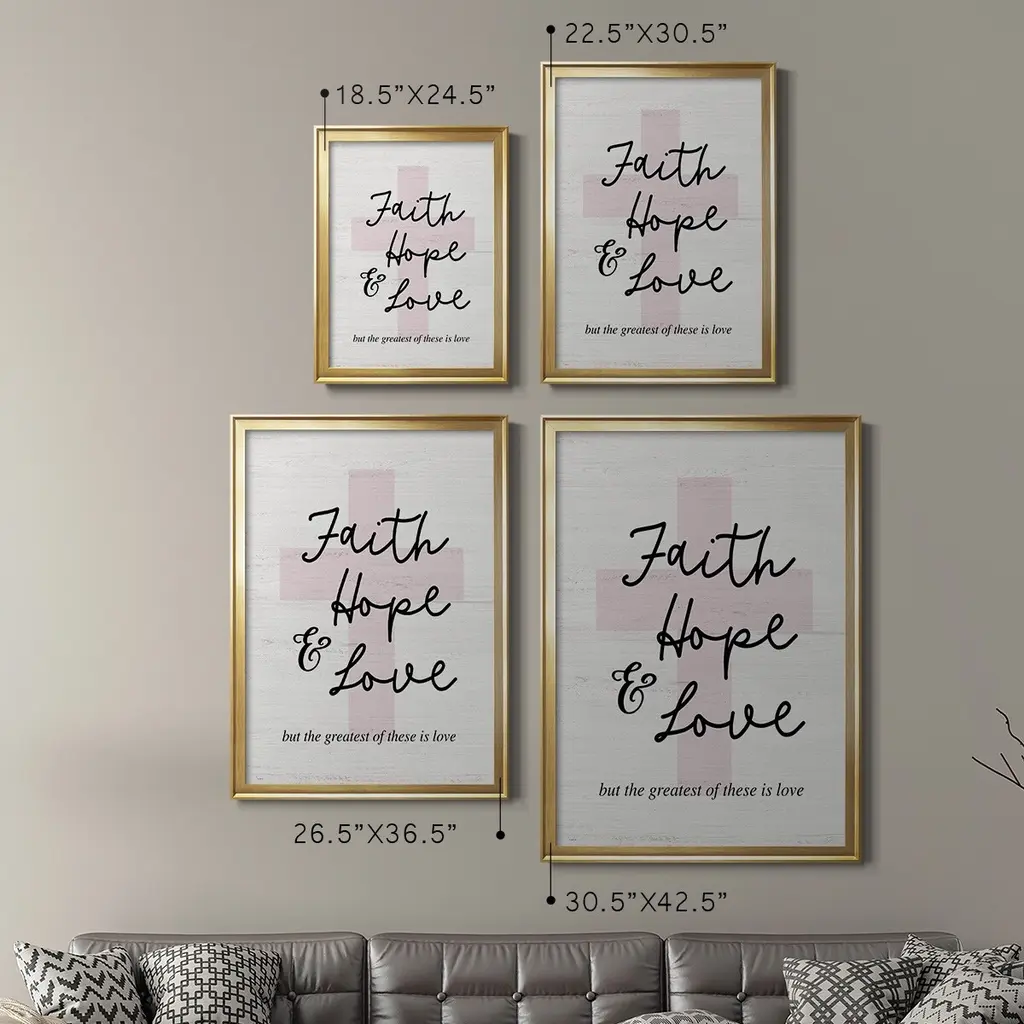 Faith Hope and Love Cross Premium Framed Print - Ready to Hang A Premium Framed Print created to last. Framed in distressed wood and available in an array of sizes and colors Featuring a beveled a solid wood stretcher bar, each piece comes ready to hand 4 SIZES AVAILABLE 30.5''X42.5'' - Overall Size 26.5'X36.5'' - Overall Size 22.5''x30.5'' - Overall Size 18.5''x24.5'' - Overall Size Each piece is made to order. Each piece comes with hanging hardware. Made in the USA Ready to Hang