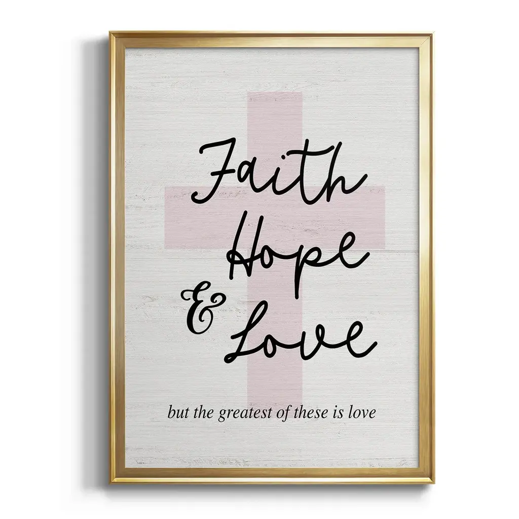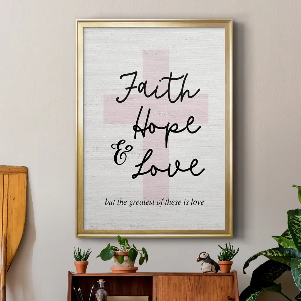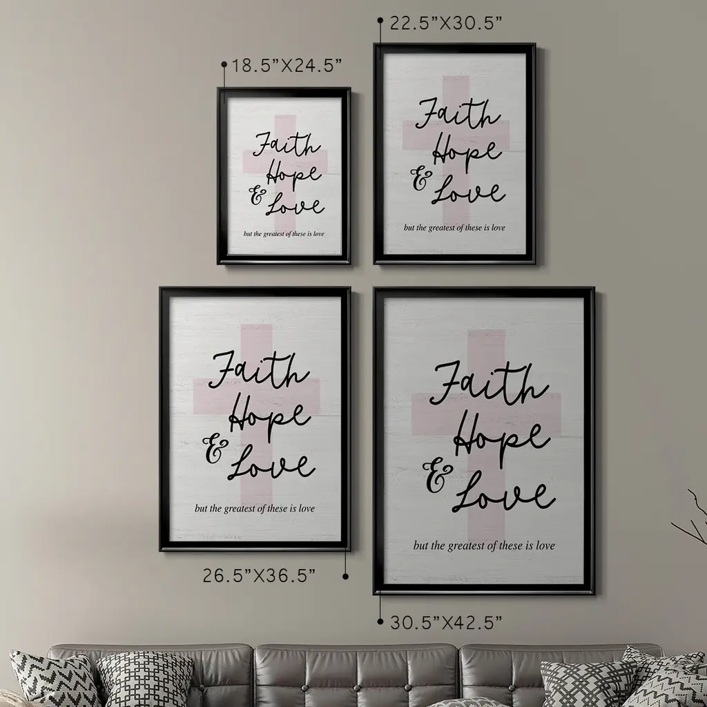 Faith Hope and Love Cross Premium Framed Print - Ready to Hang A Premium Framed Print created to last. Framed in distressed wood and available in an array of sizes and colors Featuring a beveled a solid wood stretcher bar, each piece comes ready to hand 4 SIZES AVAILABLE 30.5''X42.5'' - Overall Size 26.5'X36.5'' - Overall Size 22.5''x30.5'' - Overall Size 18.5''x24.5'' - Overall Size Each piece is made to order. Each piece comes with hanging hardware. Made in the USA Ready to Hang