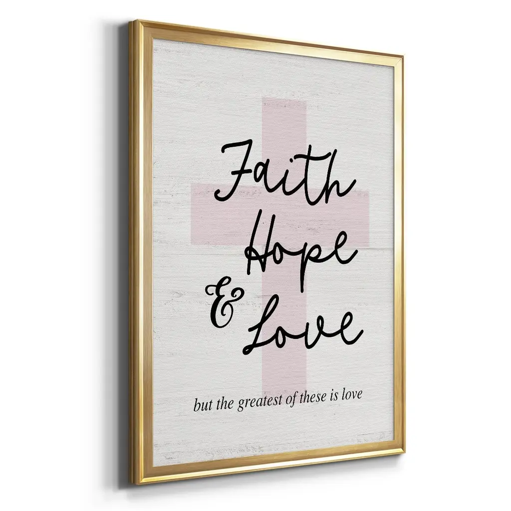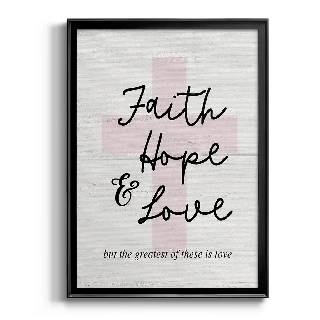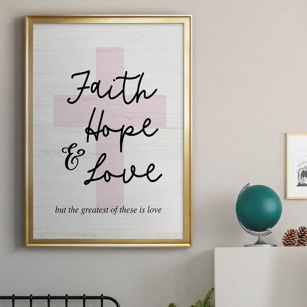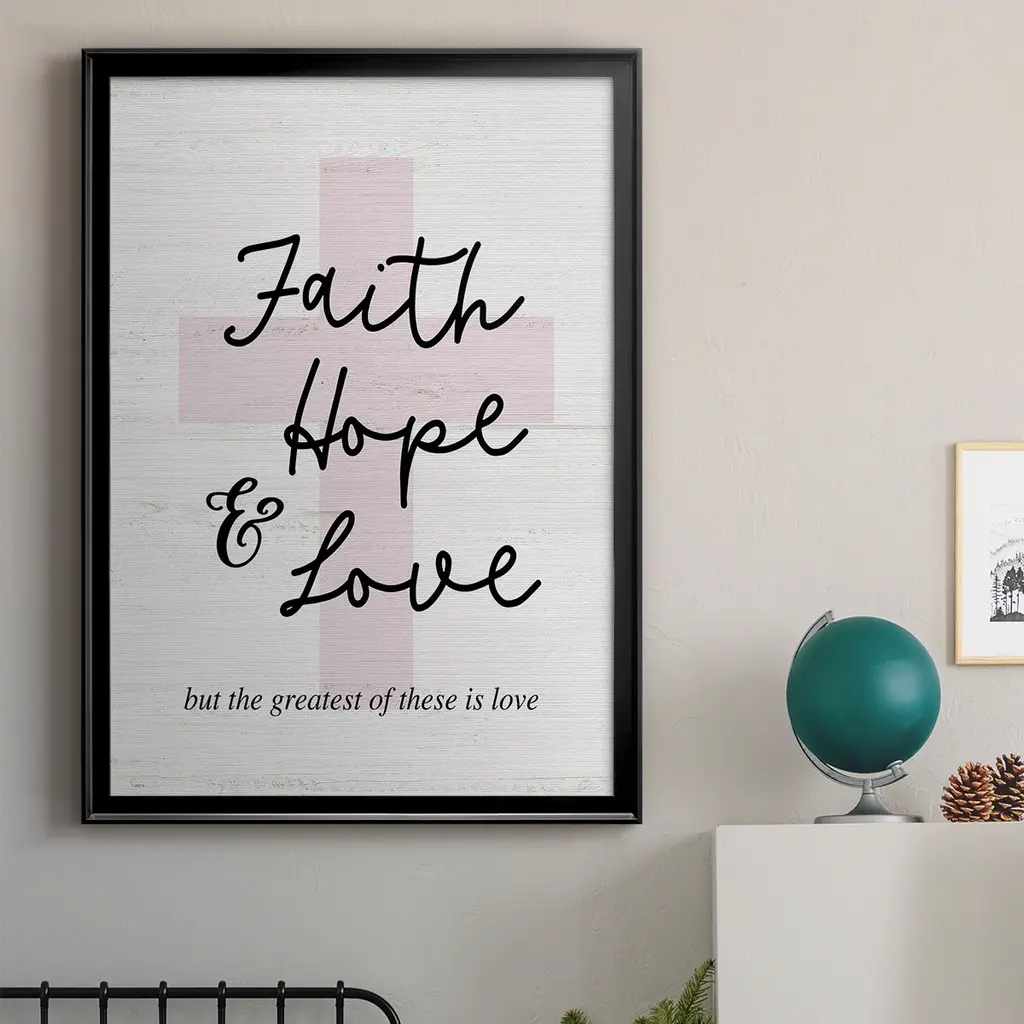 Faith Hope and Love Cross Premium Framed Print - Ready to Hang A Premium Framed Print created to last. Framed in distressed wood and available in an array of sizes and colors Featuring a beveled a solid wood stretcher bar, each piece comes ready to hand 4 SIZES AVAILABLE 30.5''X42.5'' - Overall Size 26.5'X36.5'' - Overall Size 22.5''x30.5'' - Overall Size 18.5''x24.5'' - Overall Size Each piece is made to order. Each piece comes with hanging hardware. Made in the USA Ready to Hang