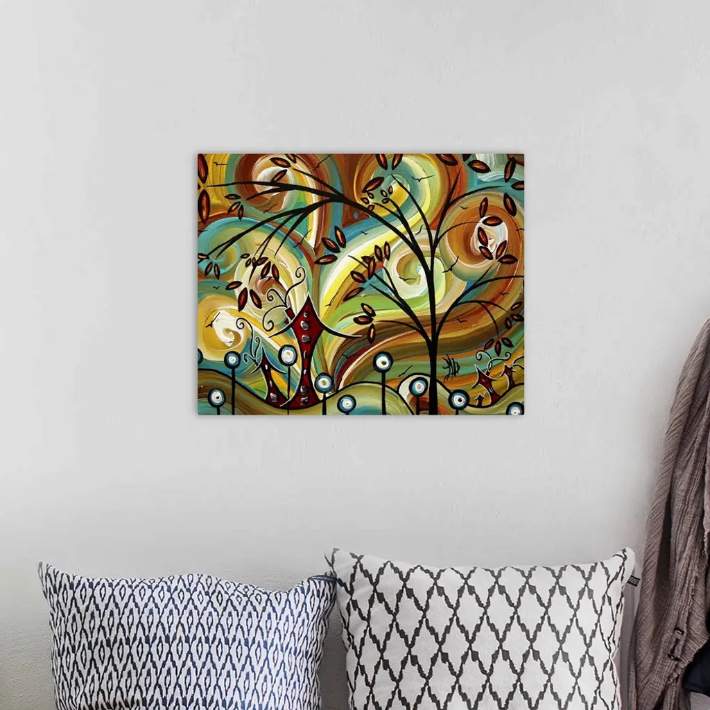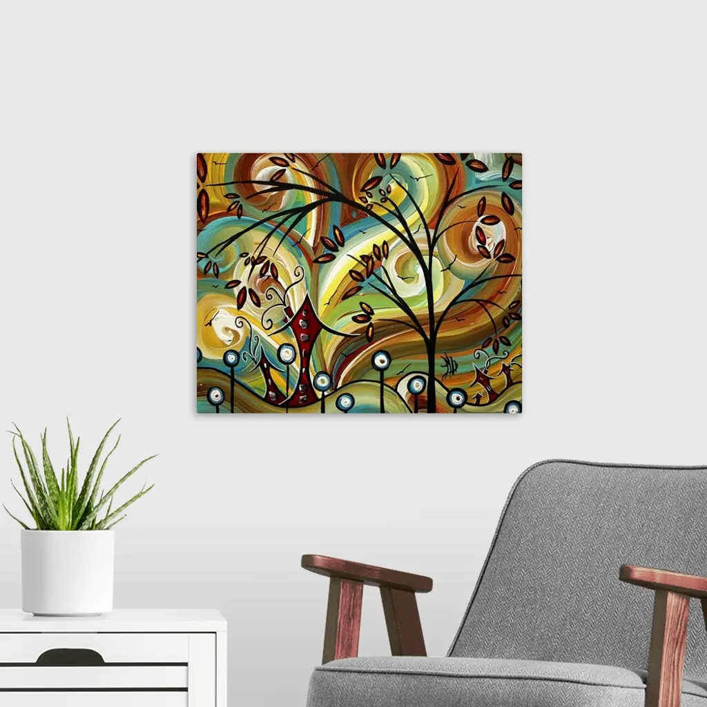 Big contemporary art involving birds flying over a large tree and flowers that are sitting in front of a few houses. Artist uses a lot of swirls, curved lines, and circles to give this painting movement.