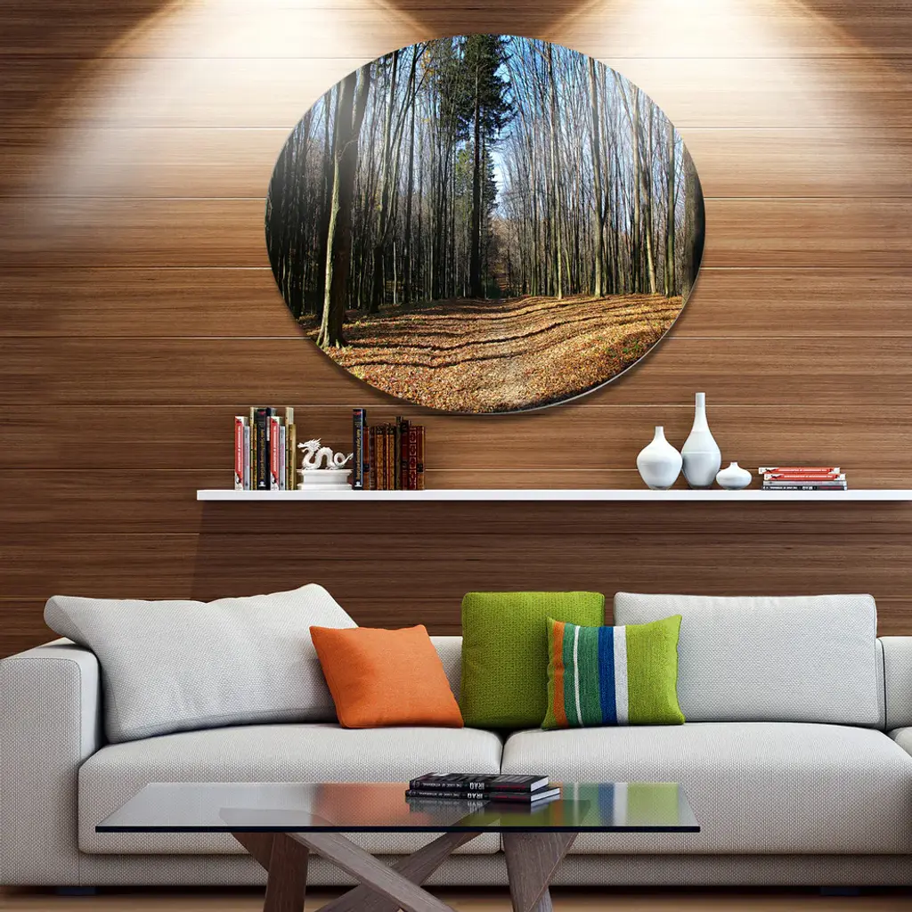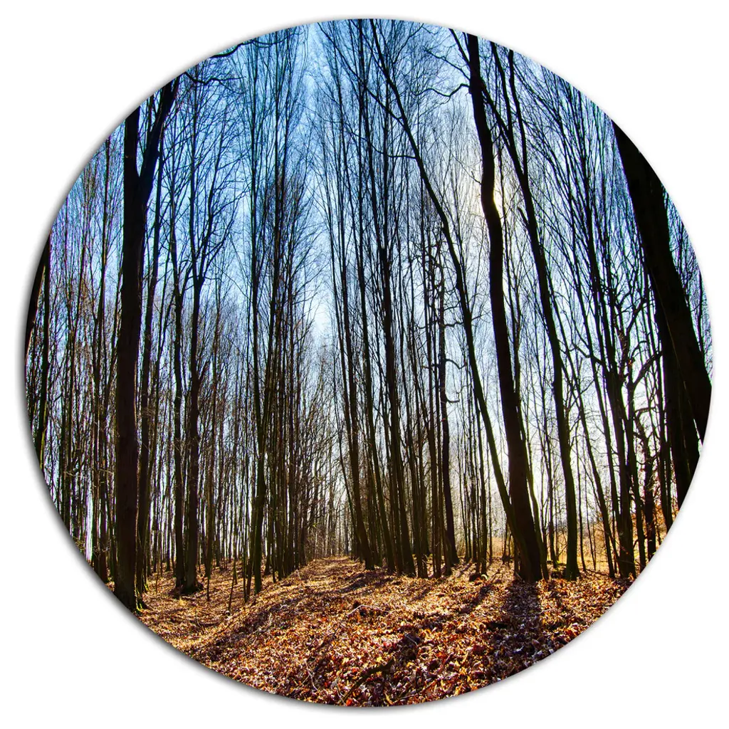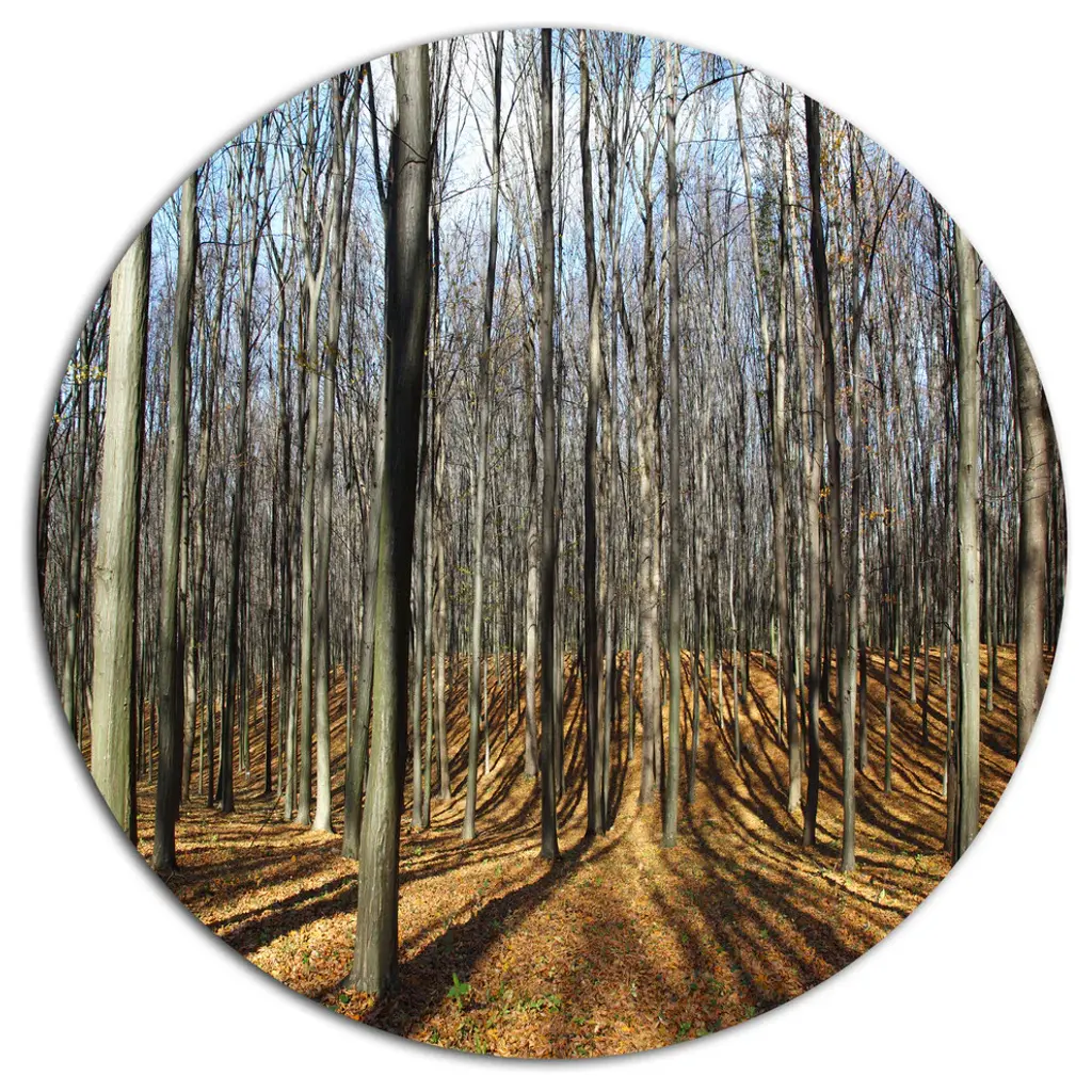 Bring Contemporary Abstraction to your home with this large Circle Metal wall art. This Fall Forest in Sunlight and Shadows Metal Artwork makes it the focal point of any room or office. - White Gloss Coating ensures colors are extra vibrant with light reflection.- Aluminum grade Sheet Metal with 1 inch mounting frame on the back giving the illusion that the artwork is floating on the wall..- Mounting Brackets are included along with instructions.- High Quality Digital images are created directly into a glossy aluminum panel producing a stunning and captivating print into the glossy finish of the metal.- Water, Fire and Scratch resistant HD Aluminum panels.- Looks better than any photo paper and guaranteed to last at least 20 years- Easy to clean with a microfiber cloth. Colors are far superior to regular Canvas Art. - Easy to Hang