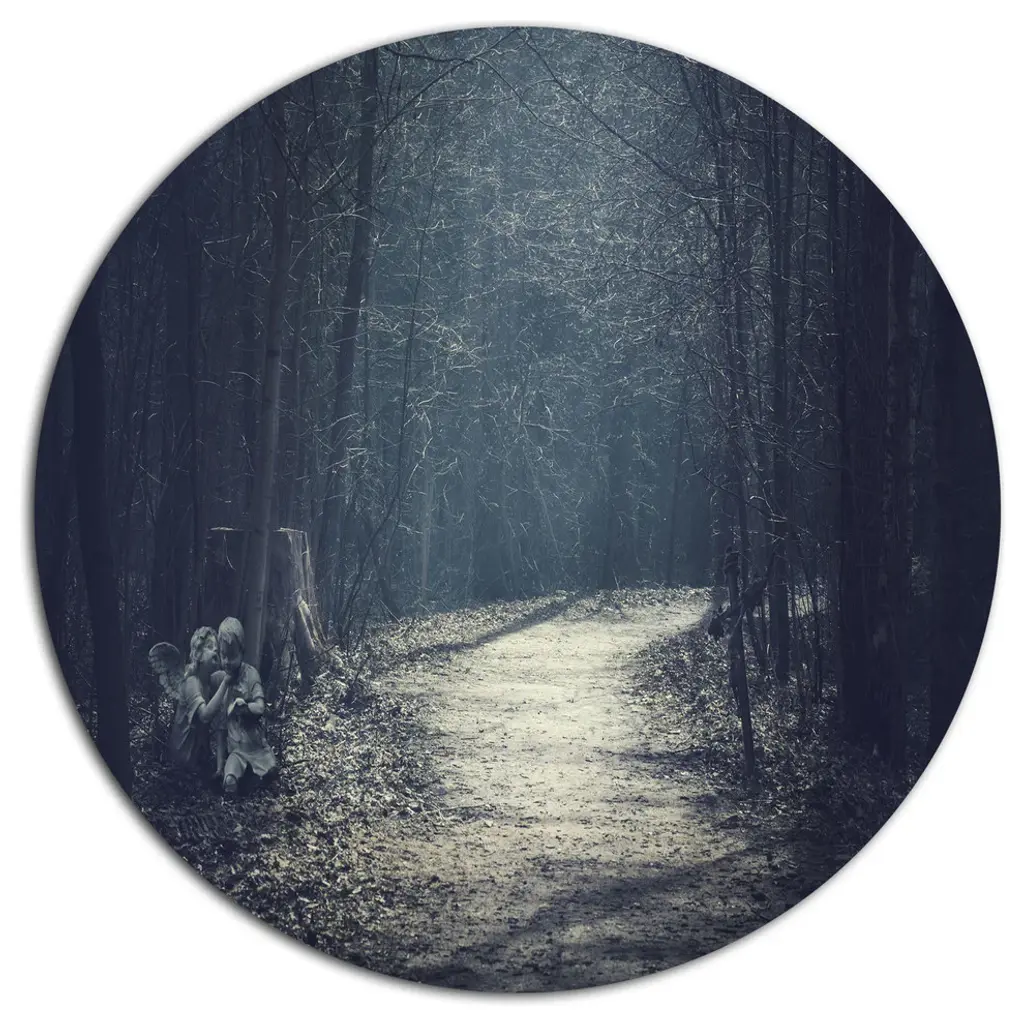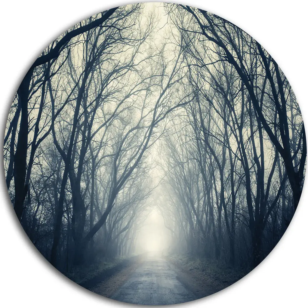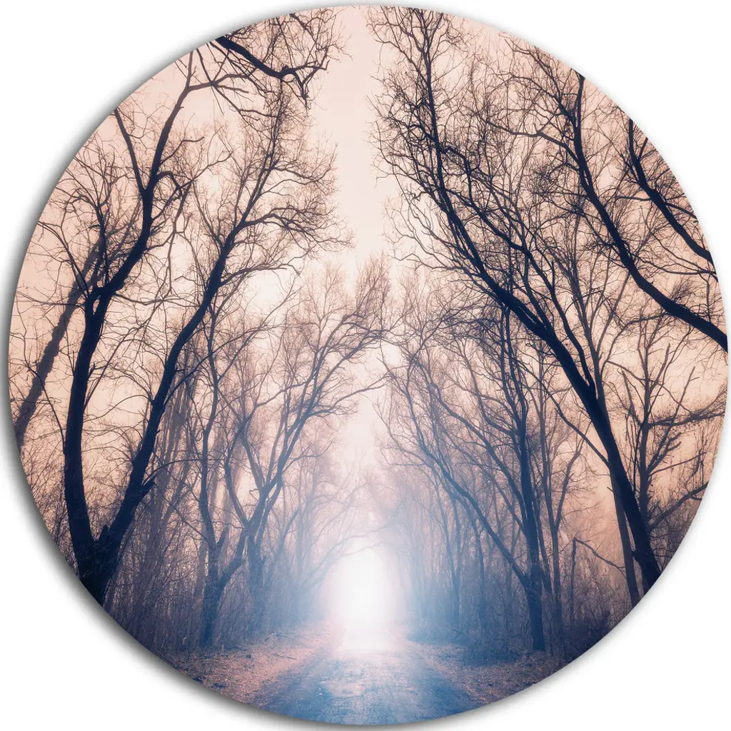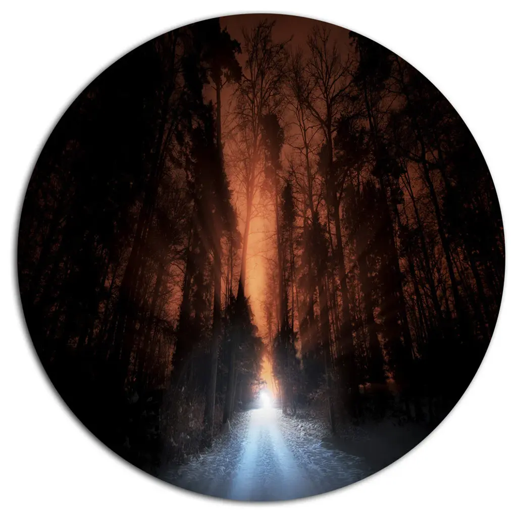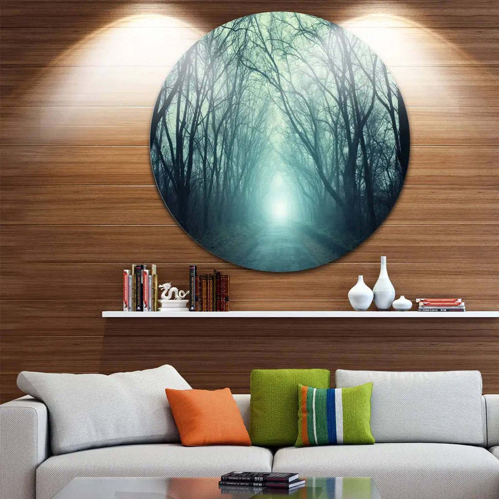 Bring Contemporary Abstraction to your home with this large Circle Metal wall art. This Fall Forest Path with Green Light Metal Artwork makes it the focal point of any room or office. - White Gloss Coating ensures colors are extra vibrant with light reflection.- Aluminum grade Sheet Metal with 1 inch mounting frame on the back giving the illusion that the artwork is floating on the wall..- Mounting Brackets are included along with instructions.- High Quality Digital images are created directly into a glossy aluminum panel producing a stunning and captivating print into the glossy finish of the metal.- Water, Fire and Scratch resistant HD Aluminum panels.- Looks better than any photo paper and guaranteed to last at least 20 years- Easy to clean with a microfiber cloth. Colors are far superior to regular Canvas Art. - Easy to Hang
