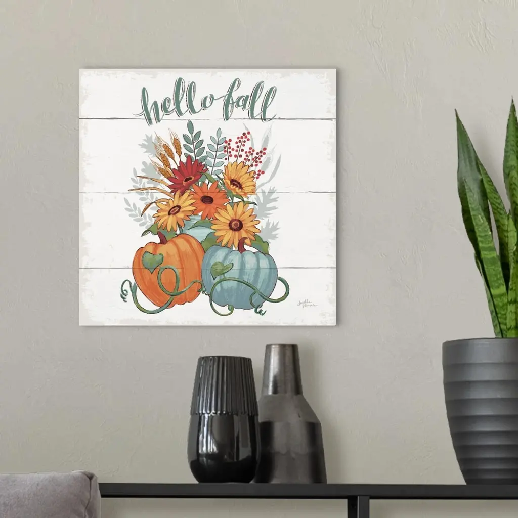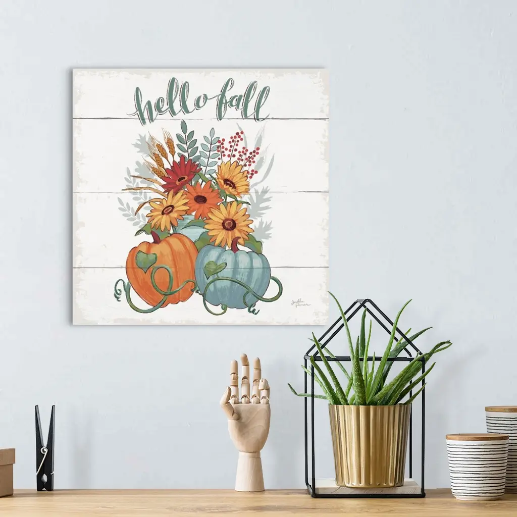 Decorative artwork of the words "Hello Fall" above a bouquet of fall flowers with pumpkins and a white wood background.