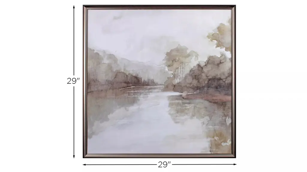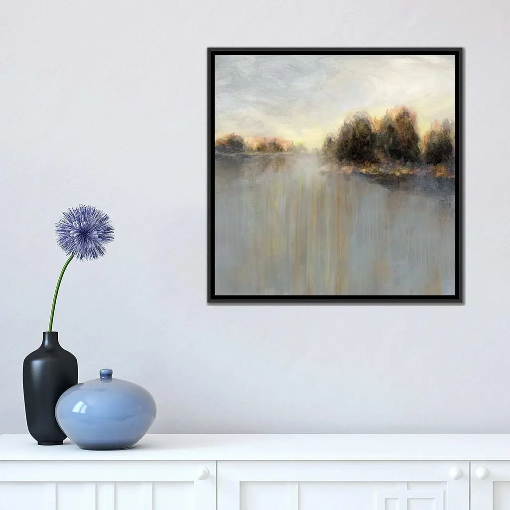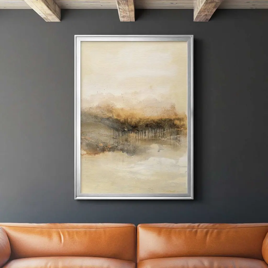 The evocative landscape of Fall Nature wall art is set in neutral tones and has bright appeal in the play of light across the water and sky. The metallic bronze frame on this print adds to a mood that's suitable for a classic and traditional style space. Picture it in an office or a reading room.