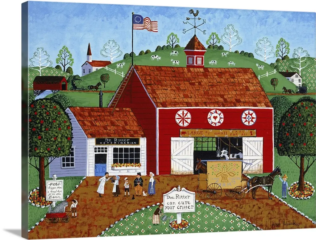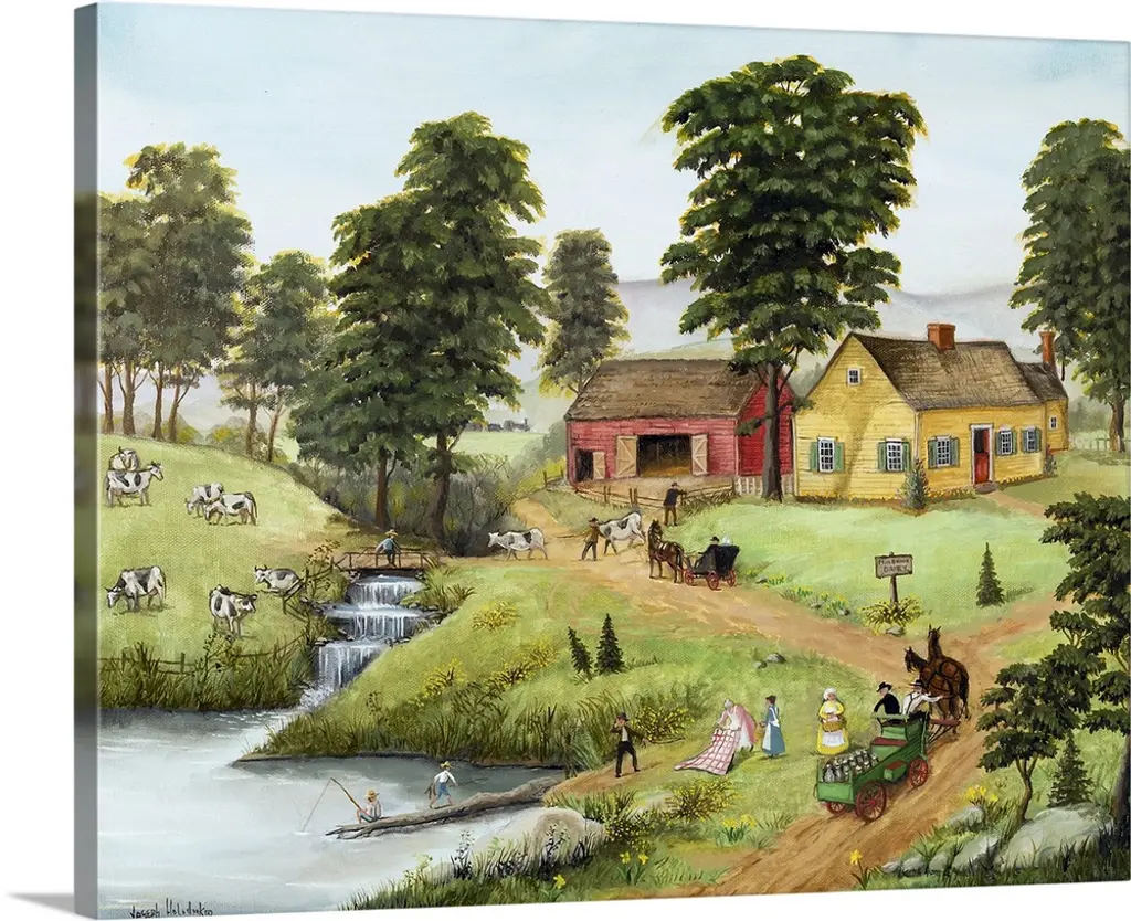 A contemporary painting of a countryside village scene in autumn.