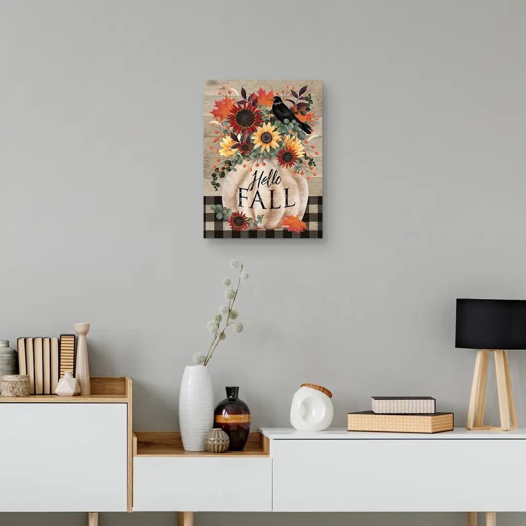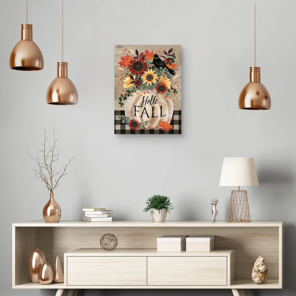 Beth Albert greets the Autumn season with her farmhouse-style wall decor Fall Pumpkin Bouquet. A sunflower and maple leaf-adorned white pumpkin sits on a black & white gingham tablecloth. The avian symbol of the season, the Raven keeps a watchful eye.