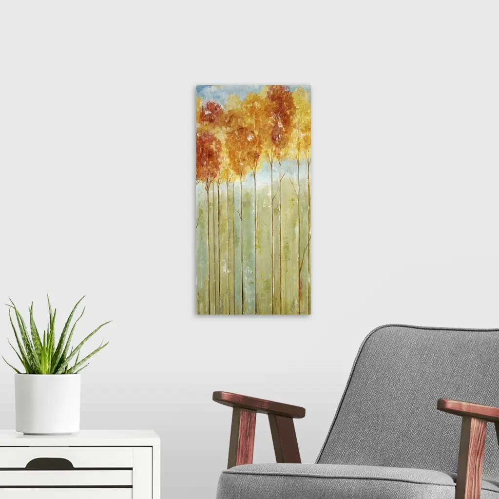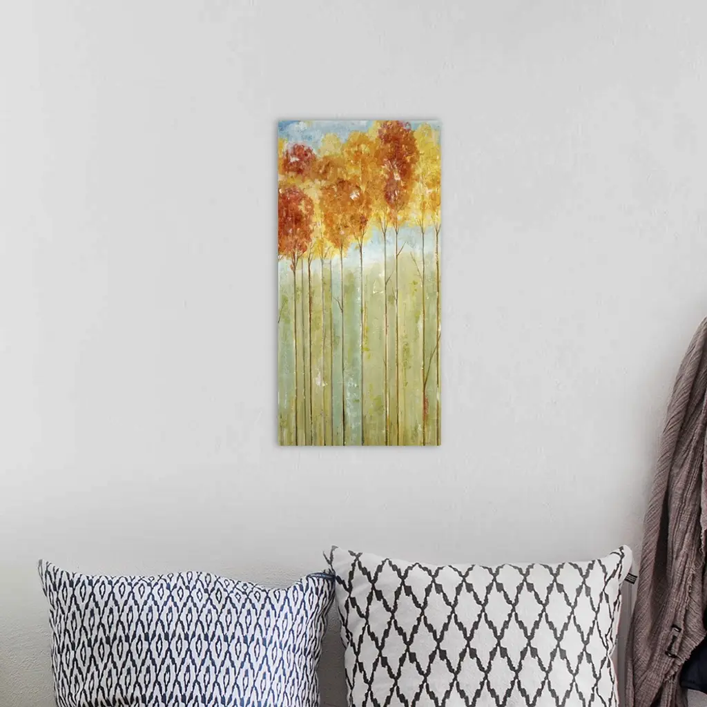 A contemporary painting of tall trees on thin trunks with autumn foliage.