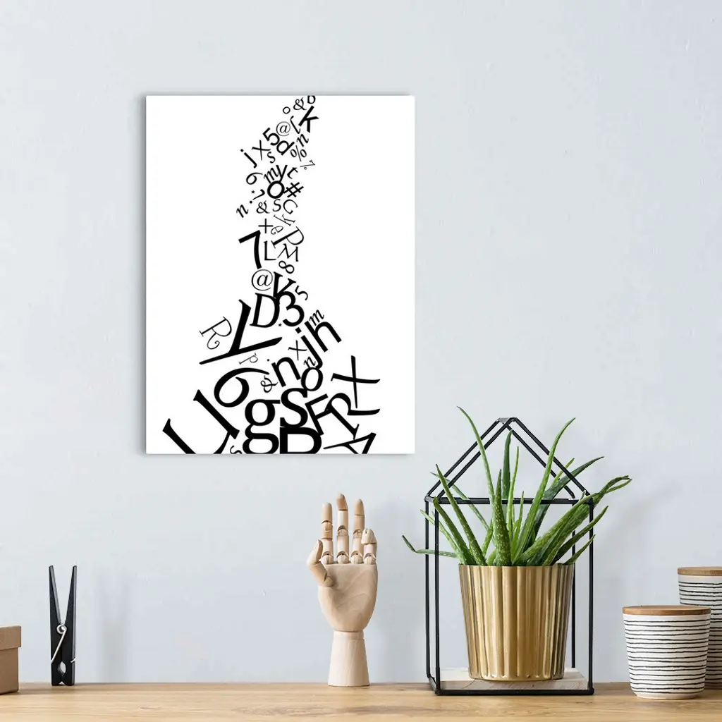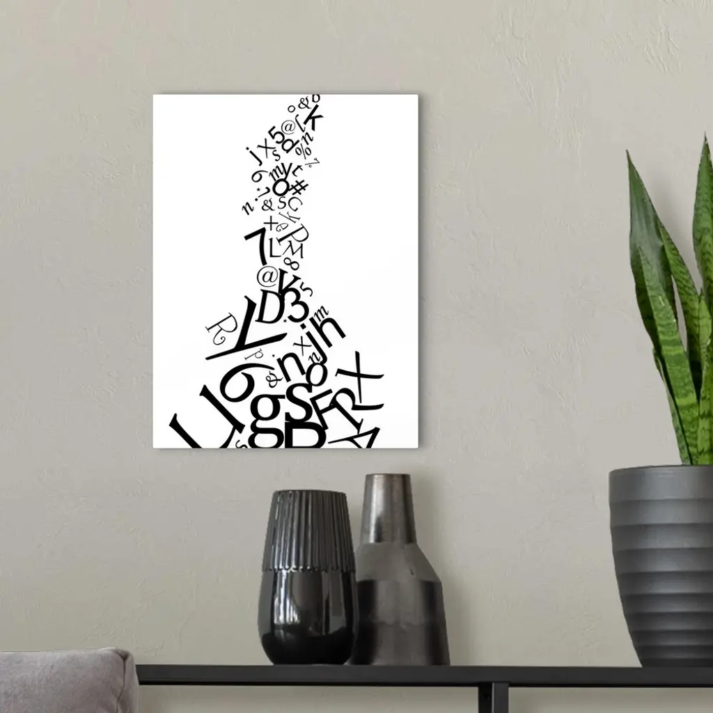 Vertical, large artwork for a living room or office of a vertical stream of letters and numbers titled in various directions, giving the appearance that they are falling into a pile at the bottom of the image.