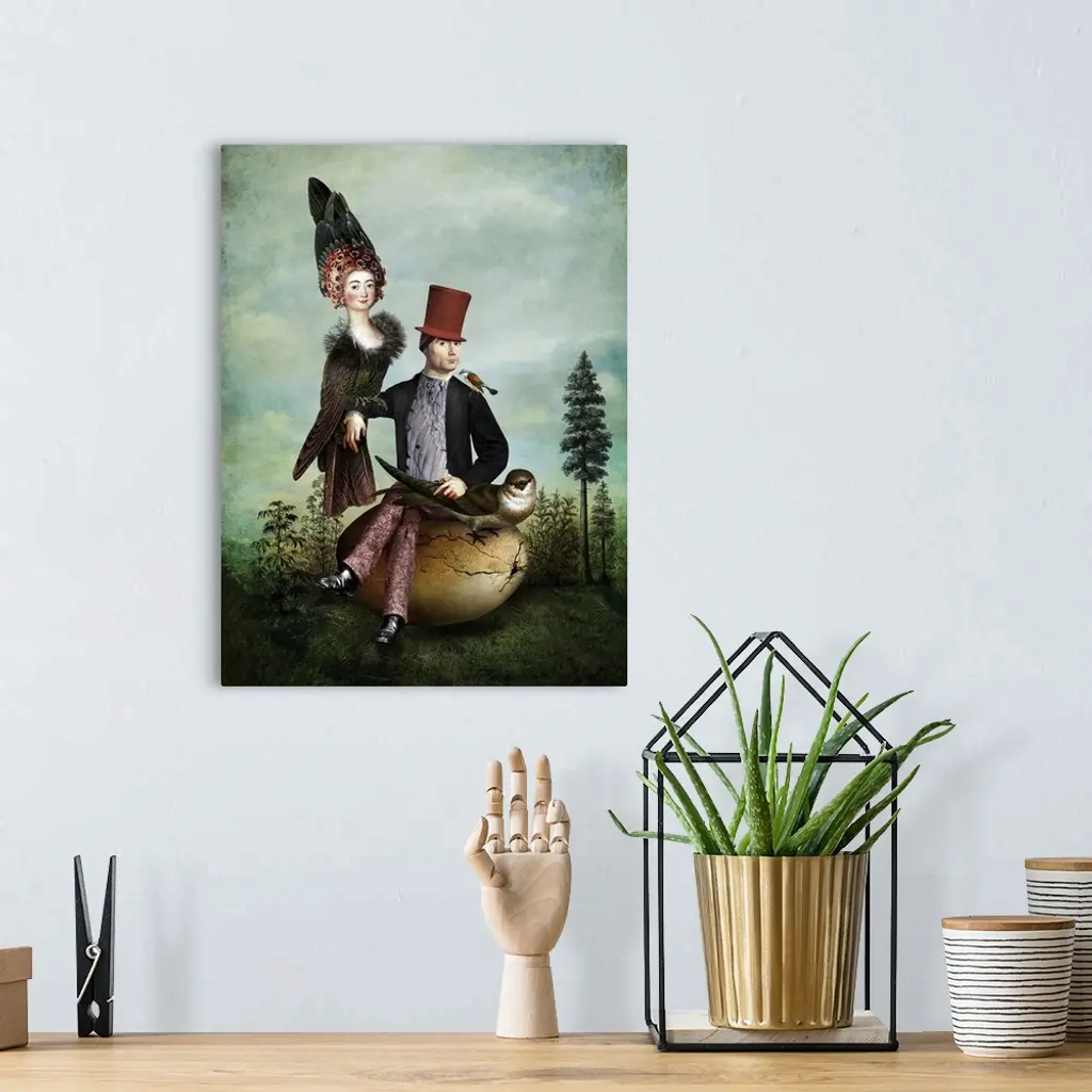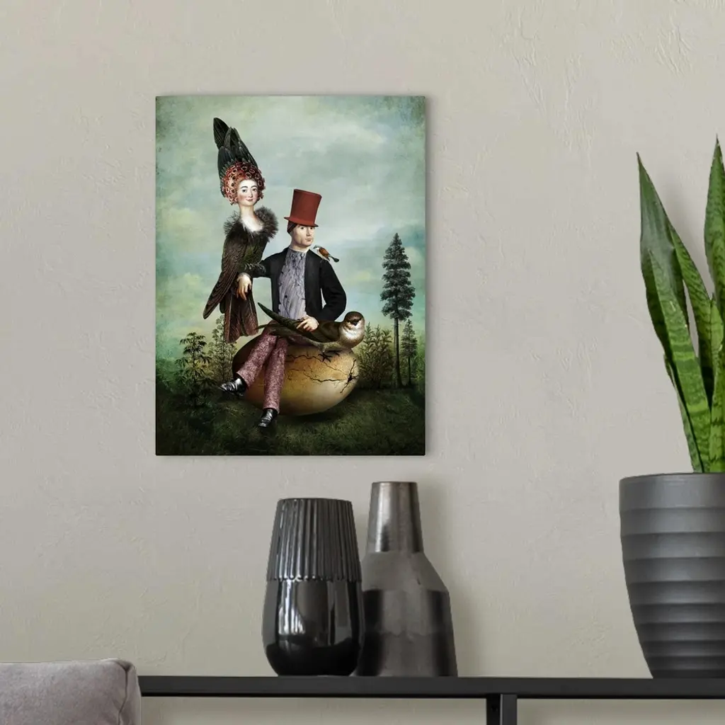 A man sitting on a large egg next to a bird has a creature that is half bird, half woman perched on his arm.