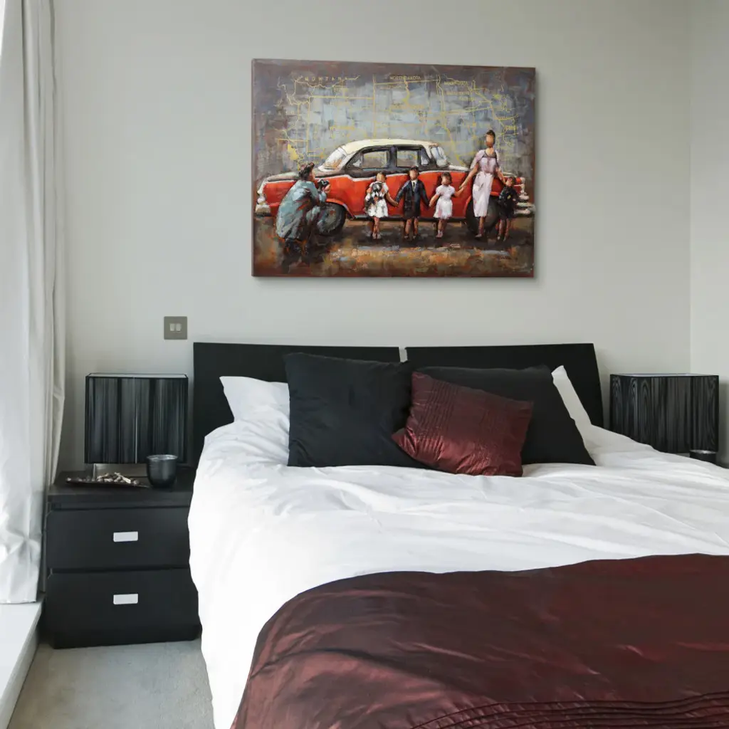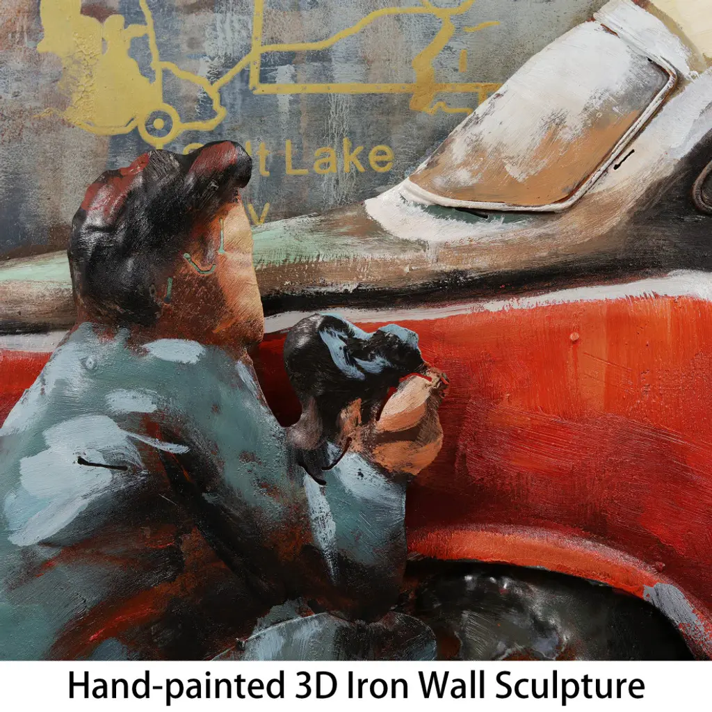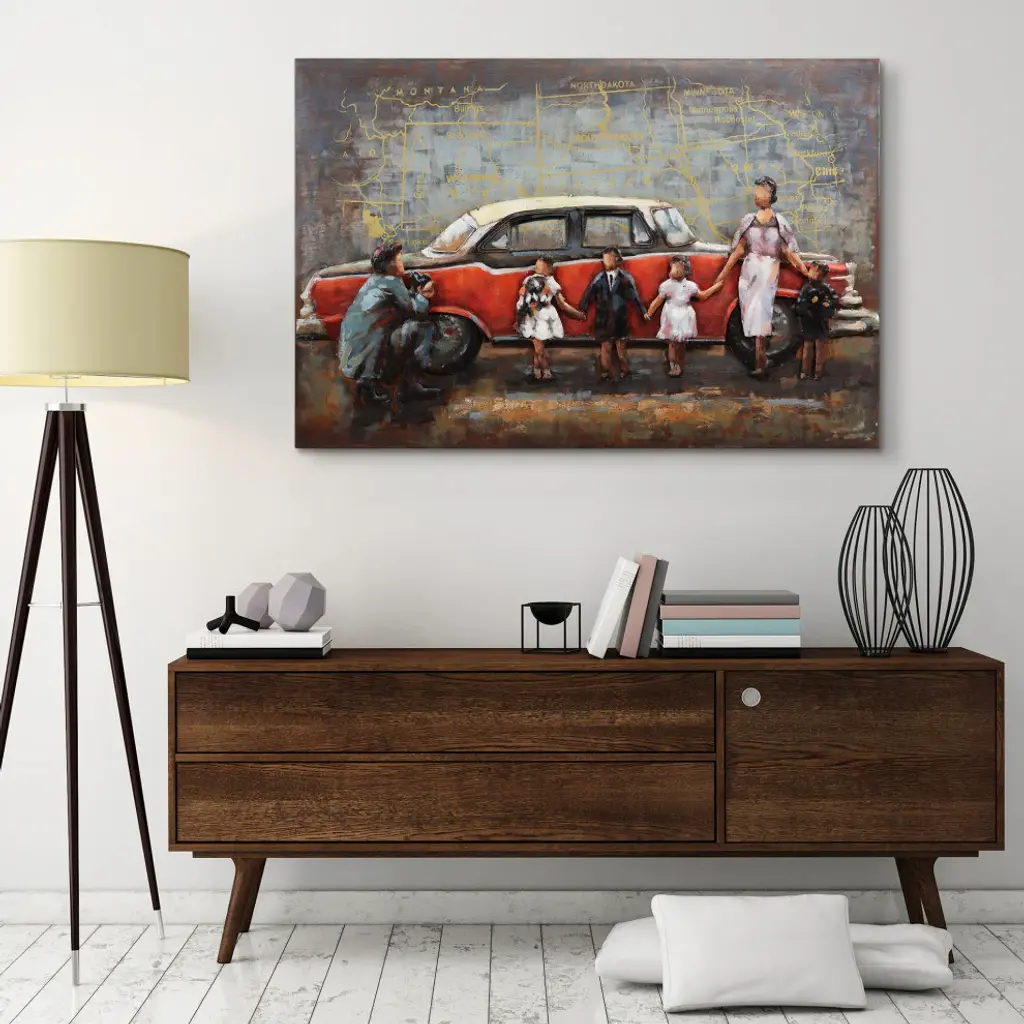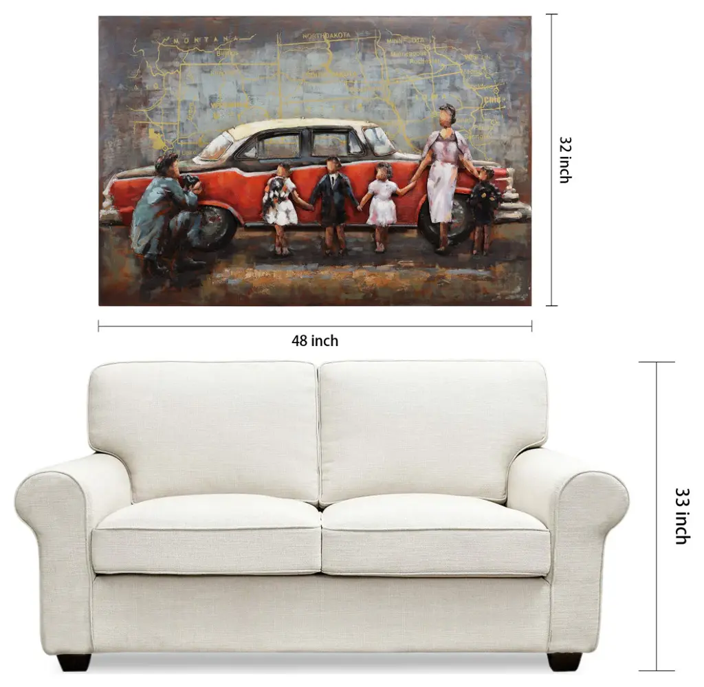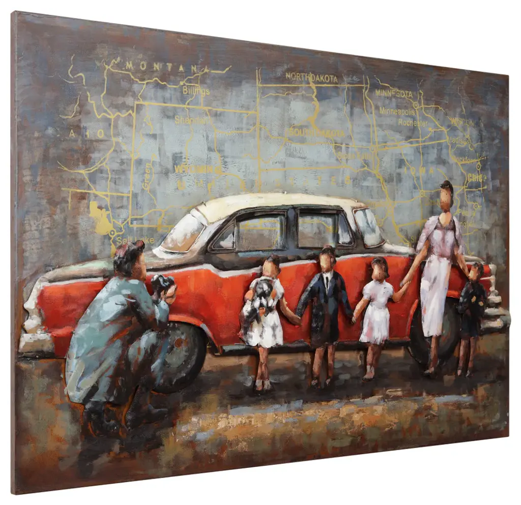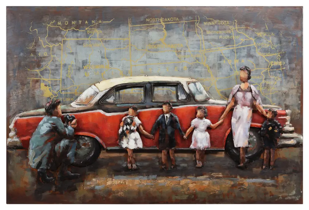 Artist Primo is proud to present his three-dimensional iron wall sculptures. This collection represents the culmination of Primo''s dream to take his original artwork and make them available to all that love his concepts in. This 32" x 48" unique original is hand painted and a signed work of art that''s renown for Primo''s skills of manipulating iron into a textured work of art with extraordinary depth and skill. For this piece, Primo depicts a mother and her beautiful children posing for a picture in front of their new car, taken by dad of course. This industrial style of mixed media can also be presented outdoors as long as it is varnished every year, as it will take on a patina characteristic that is inherent in its presentation.