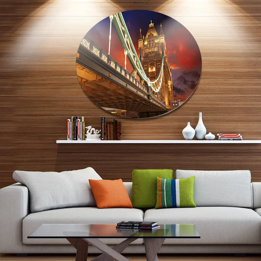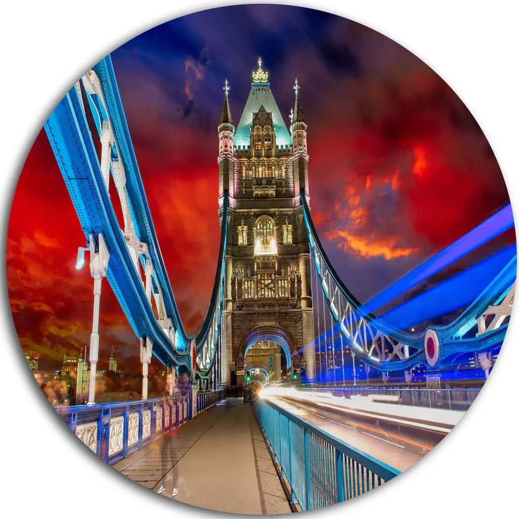 Bring Contemporary Abstraction to your home with this large Circle Metal wall art. This Famous Tower Bridge at Night Metal Artwork makes it the focal point of any room or office. - White Gloss Coating ensures colors are extra vibrant with light reflection.- Aluminum grade Sheet Metal with 1 inch mounting frame on the back giving the illusion that the artwork is floating on the wall..- Mounting Brackets are included along with instructions.- High Quality Digital images are created directly into a glossy aluminum panel producing a stunning and captivating print into the glossy finish of the metal.- Water, Fire and Scratch resistant HD Aluminum panels.- Looks better than any photo paper and guaranteed to last at least 20 years- Easy to clean with a microfiber cloth. Colors are far superior to regular Canvas Art. - Easy to Hang