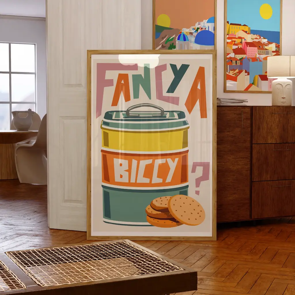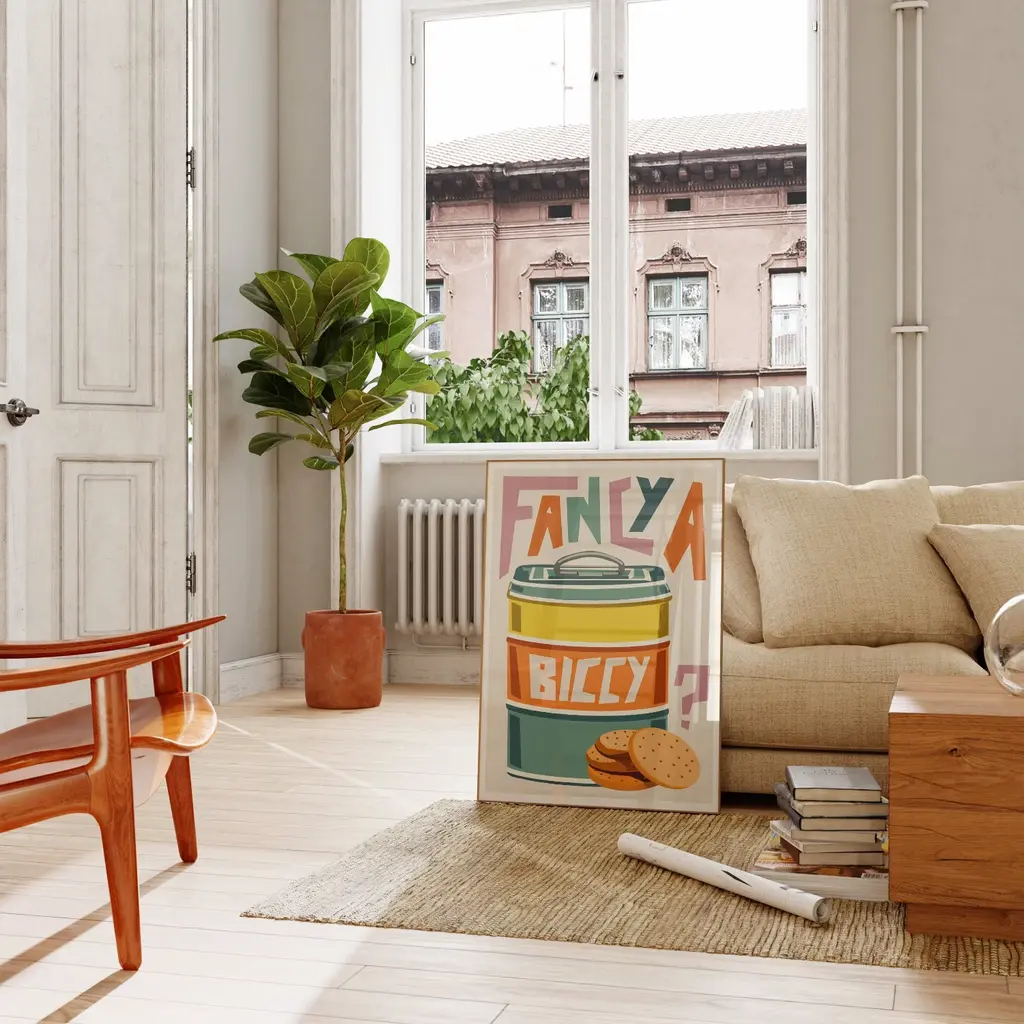 Fancy A Biccy Print - A2 sizePerfect for kitchens, dining rooms, or as a gift for biscuit enthusiasts, this print adds a touch of sweetness and nostalgia to any space. This print will bring a smile to anyone that sees it! All prints are digitally designed by myself and printed to order.Smooth fine art 230 gsm matte card. Printed with vivid colour and detail. Sold without a frame.
