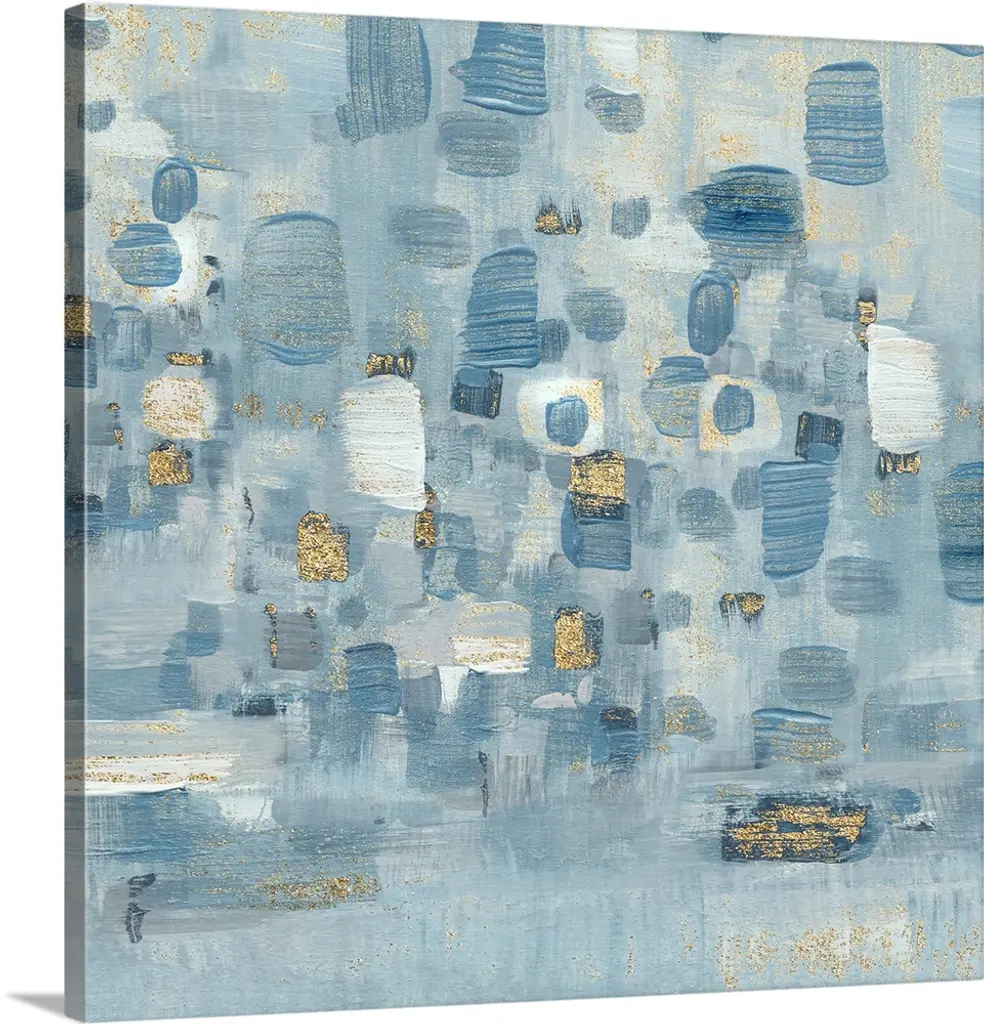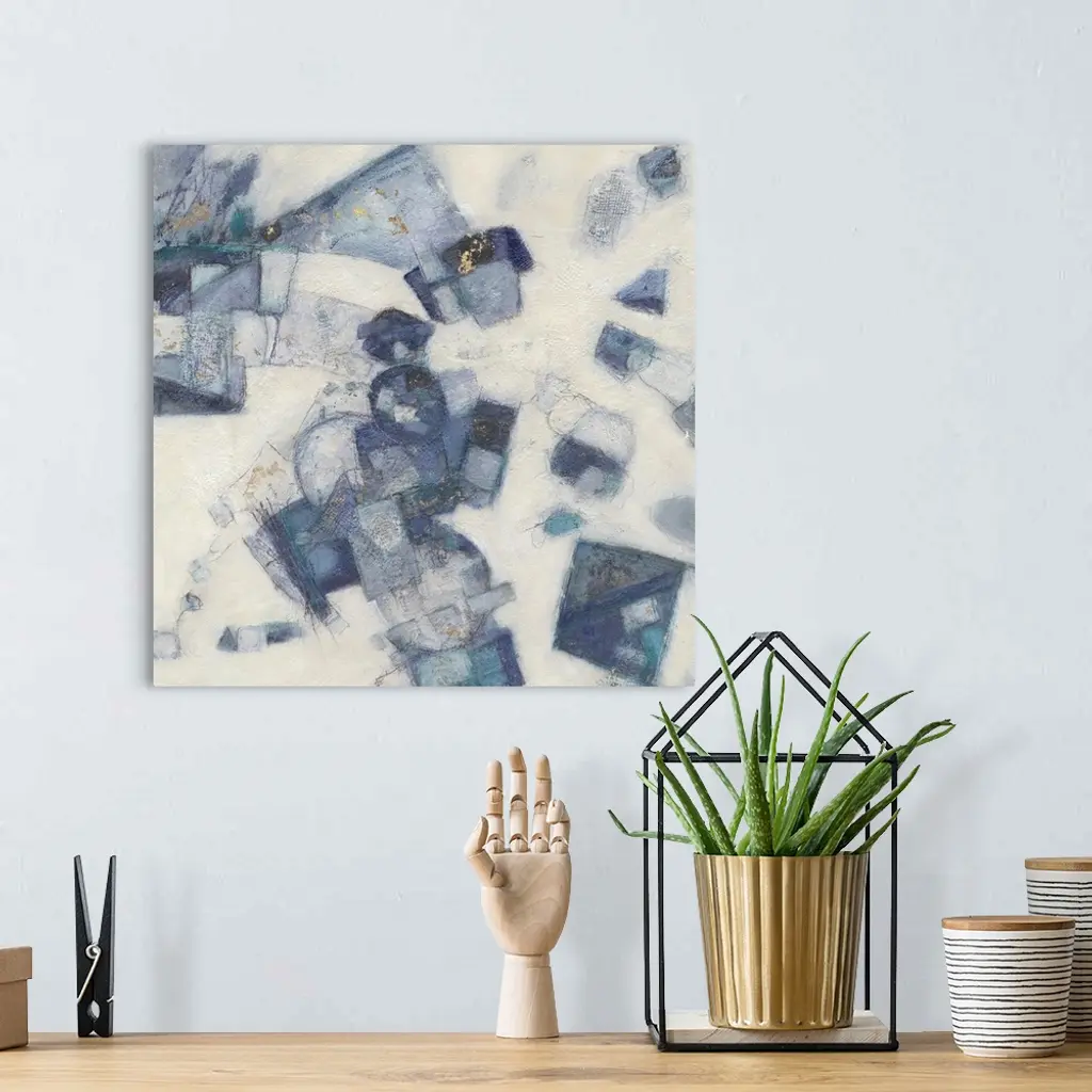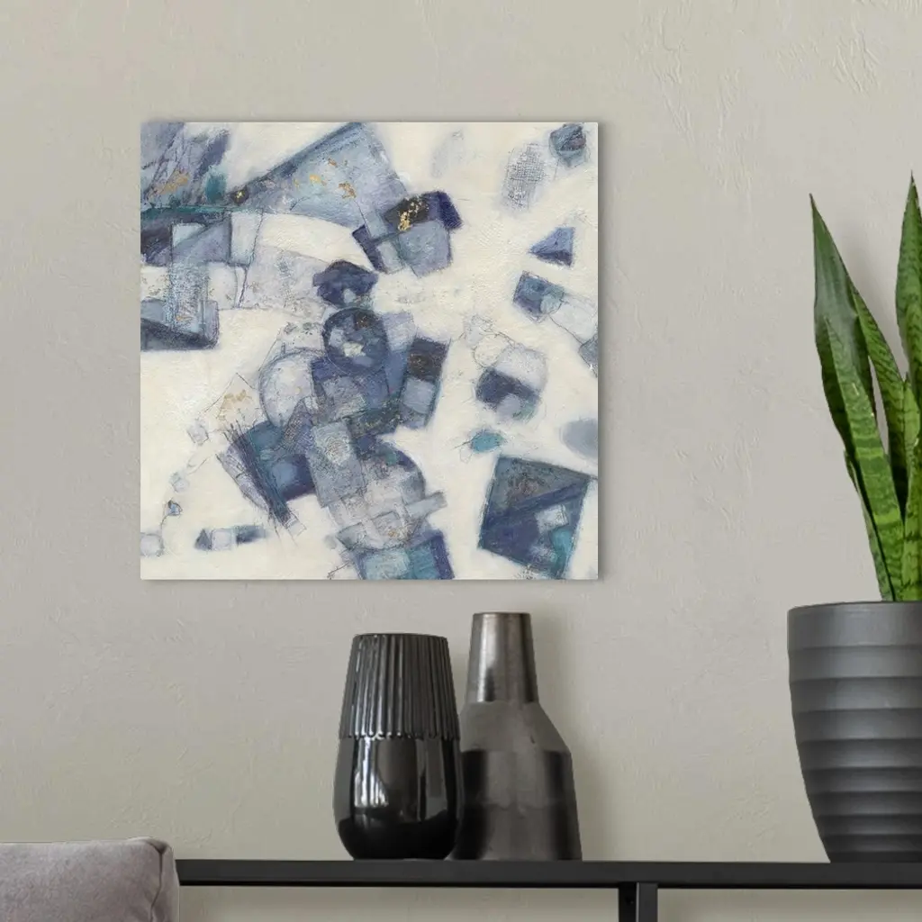 Square abstract painting with shapes layered together in shades of blue on a white textured background with metallic gold on top throughout.