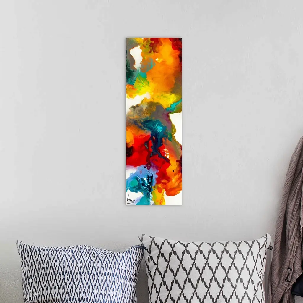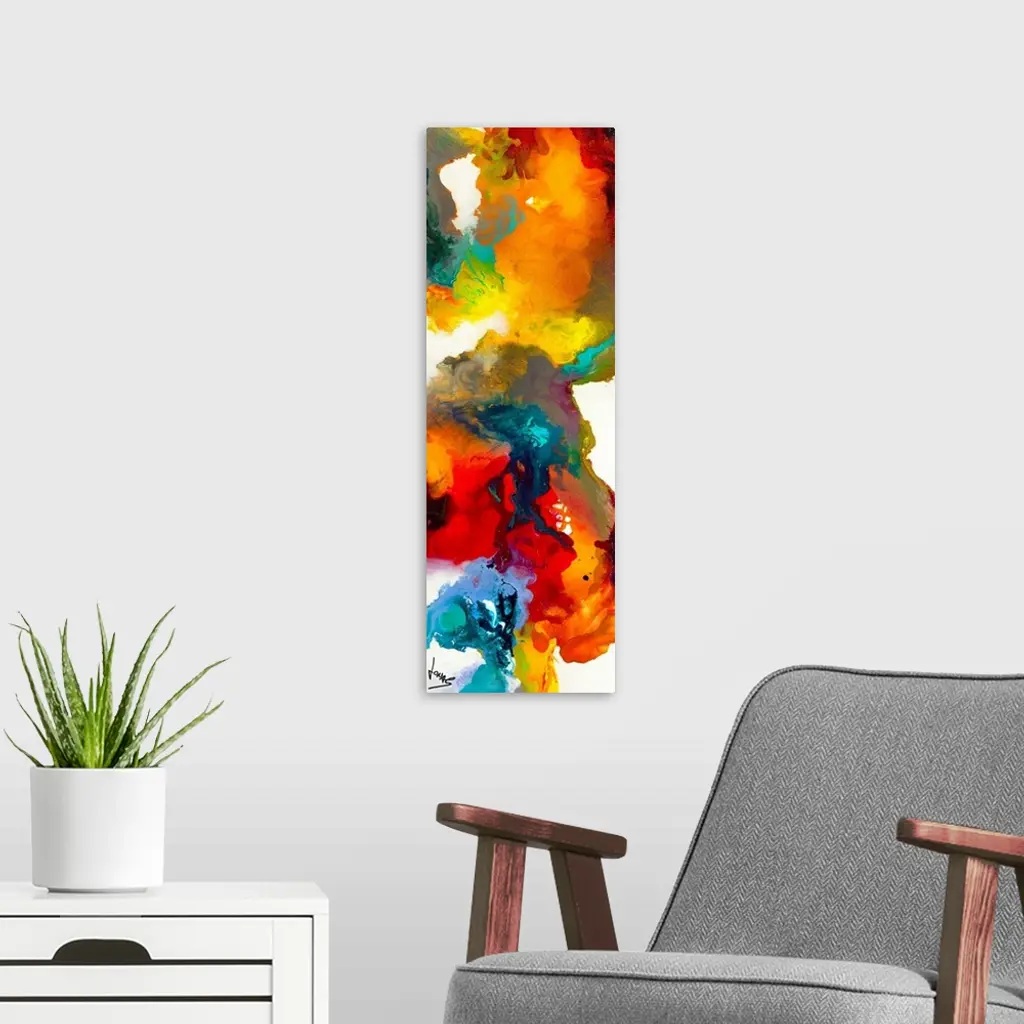This is a narrow vertical panoramic shaped painting of a vivid blend of wet paints creating a swirling energy on the surface of this wall art.