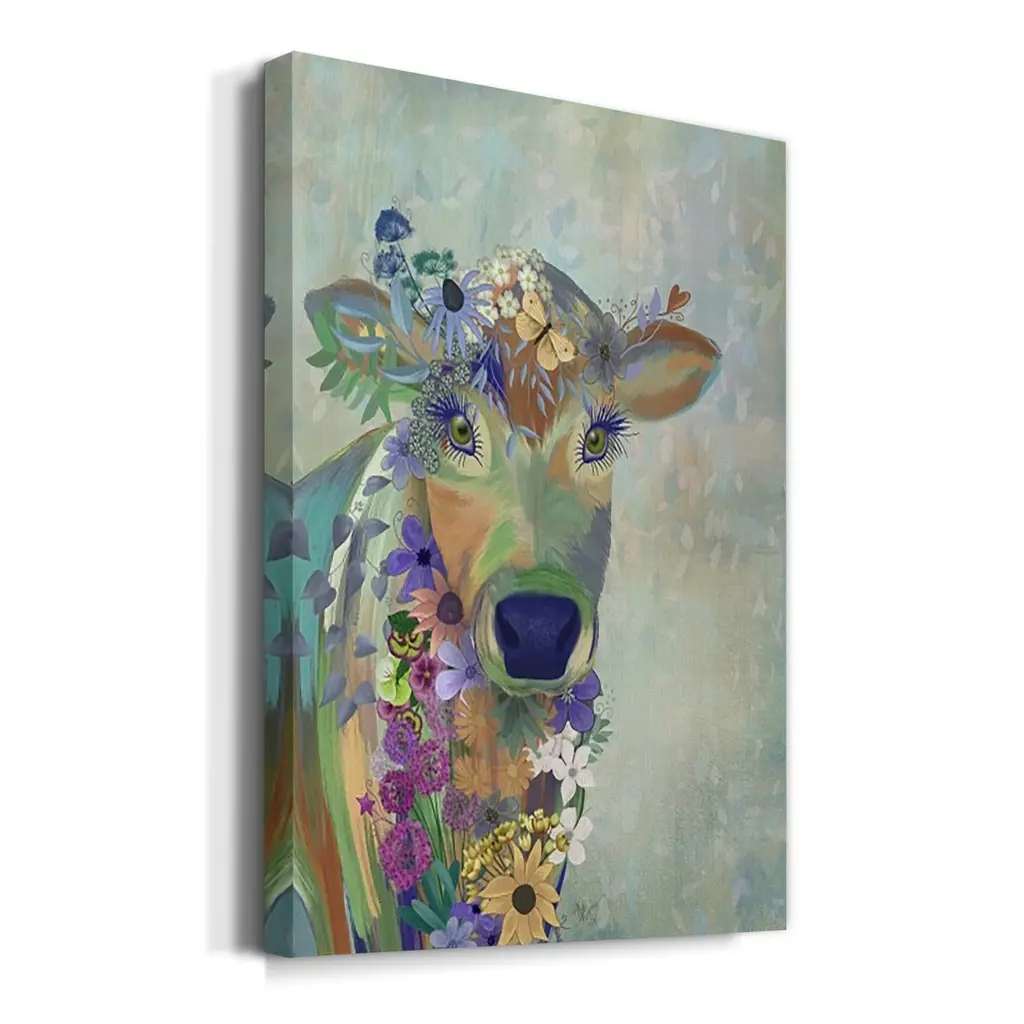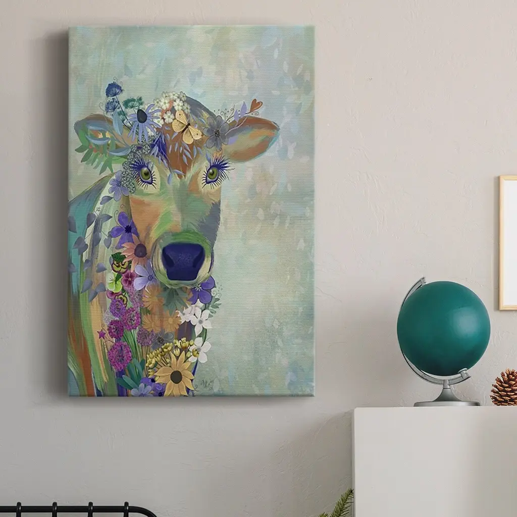 Fantastic Florals Cow Premium Gallery Wrapped Canvas - Ready to Hang A premium hand stretched gallery wrapped canvas print created to last. Featuring a beveled a solid wood stretcher bar, each piece comes ready to hand 6 SIZES AVAILABLE 8''X12'' - Overall Size 12''X18'' - Overall Size 18''X27'' - Overall Size 24''x36'' - Overall Size 32''x48'' - Overall Size 40''x60'' - Overall Size Each piece is made to order. Built to Last Each piece comes ready to hang Solid wood stretcher Fade and Water resistant Made domestically
