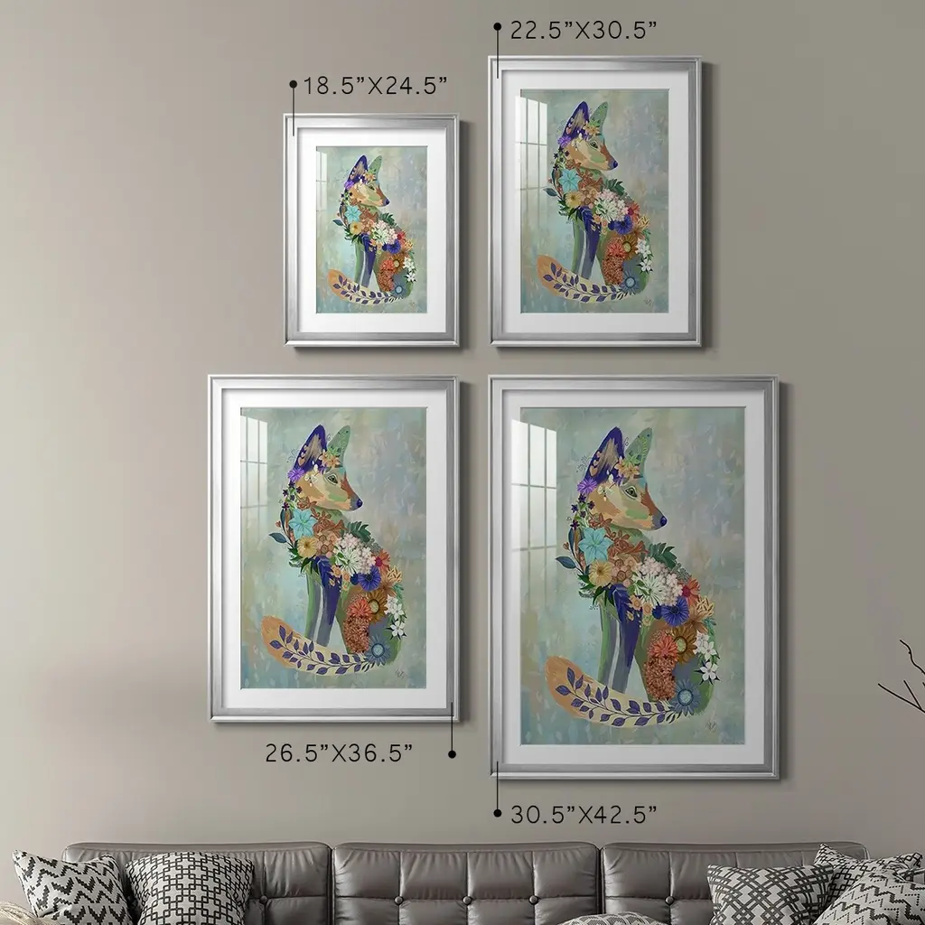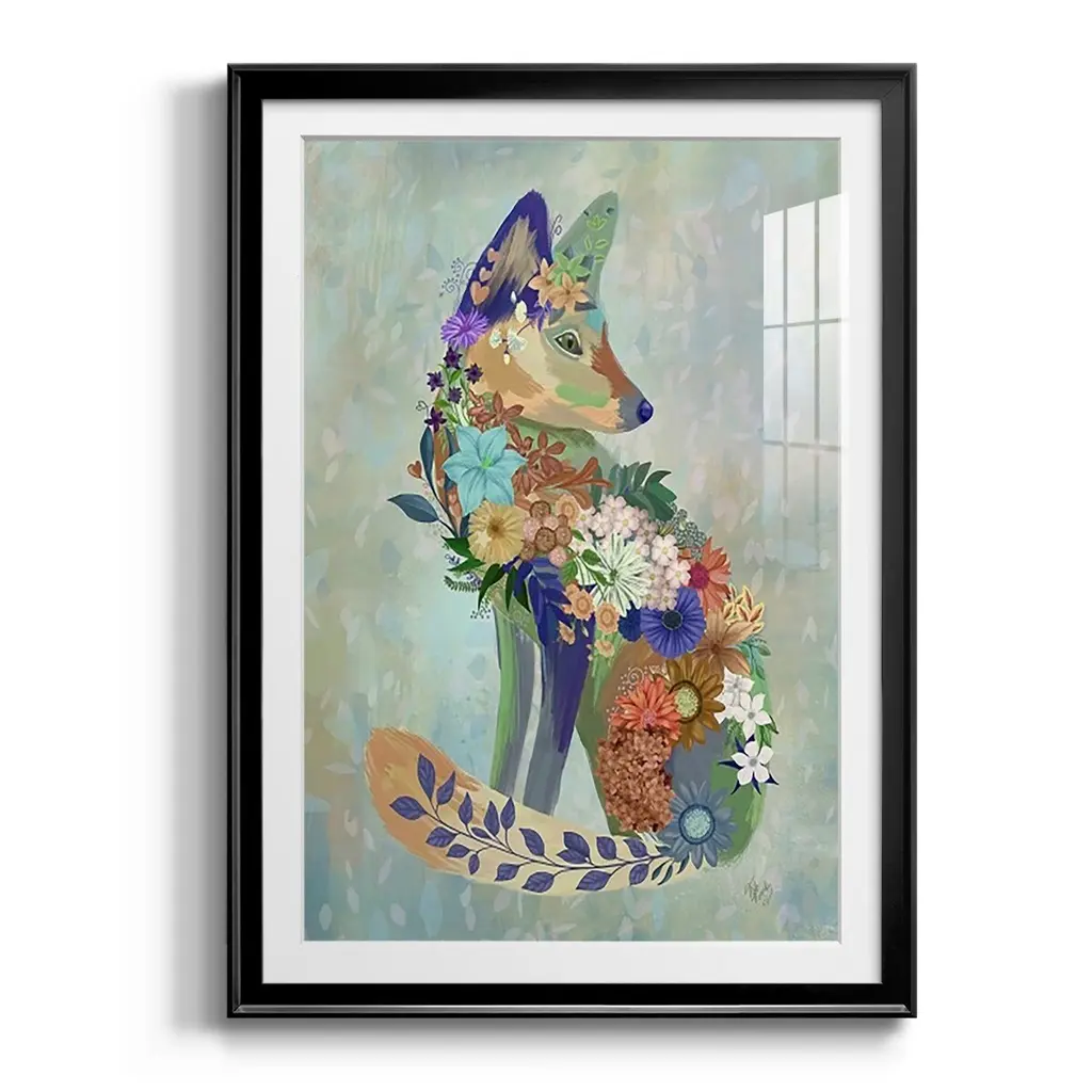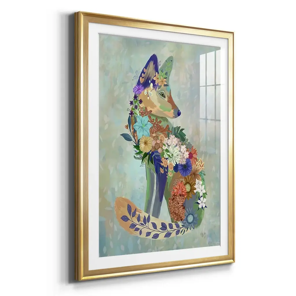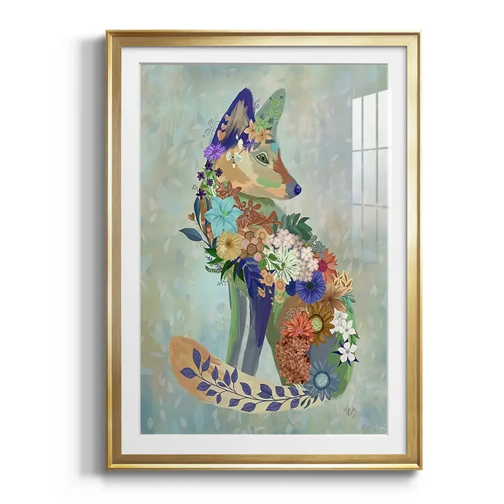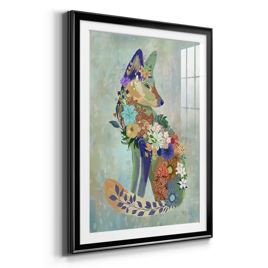 Fantastic Florals Fox, Sitting Premium Framed Print - Ready to Hang A Premium Framed Print created to last. Framed in distressed wood and available in an array of sizes and colors Featuring a beveled a solid wood stretcher bar, each piece comes ready to hand 4 SIZES AVAILABLE 30.5''X42.5'' - Overall Size 26.5'X36.5'' - Overall Size 22.5''x30.5'' - Overall Size 18.5''x24.5'' - Overall Size Each piece is made to order. Each piece comes with hanging hardware. Made in the USA Ready to Hang Giclee Paper Print Acrylic Glass Beveled Matt Board