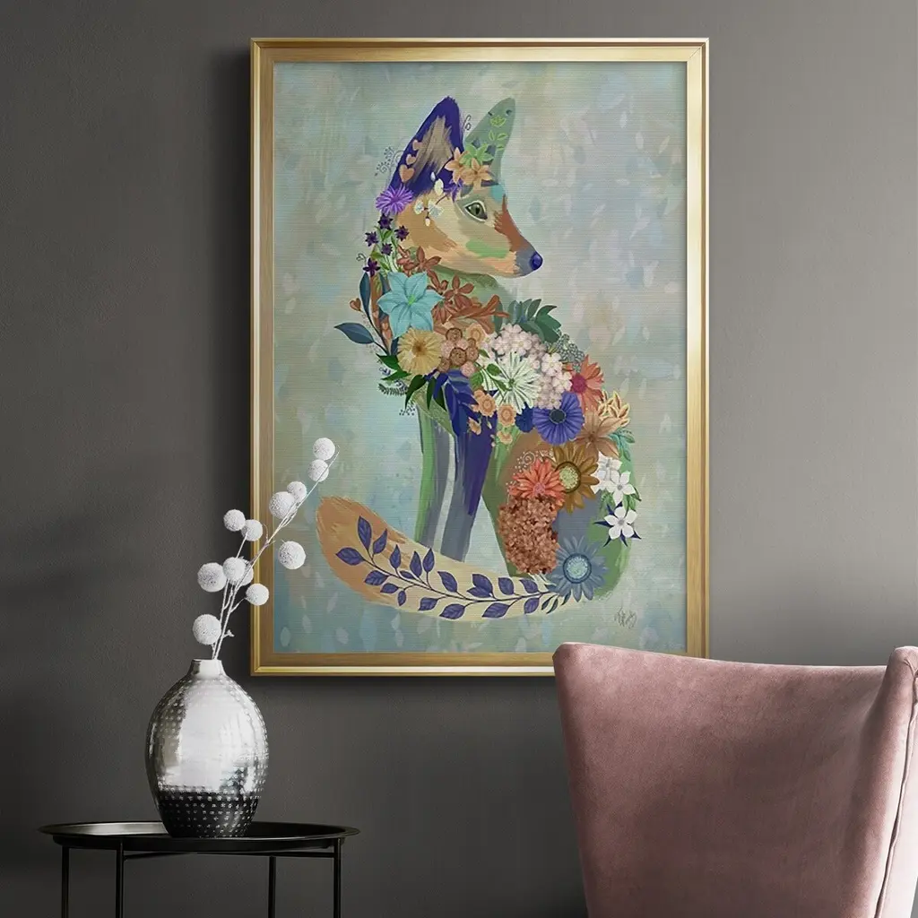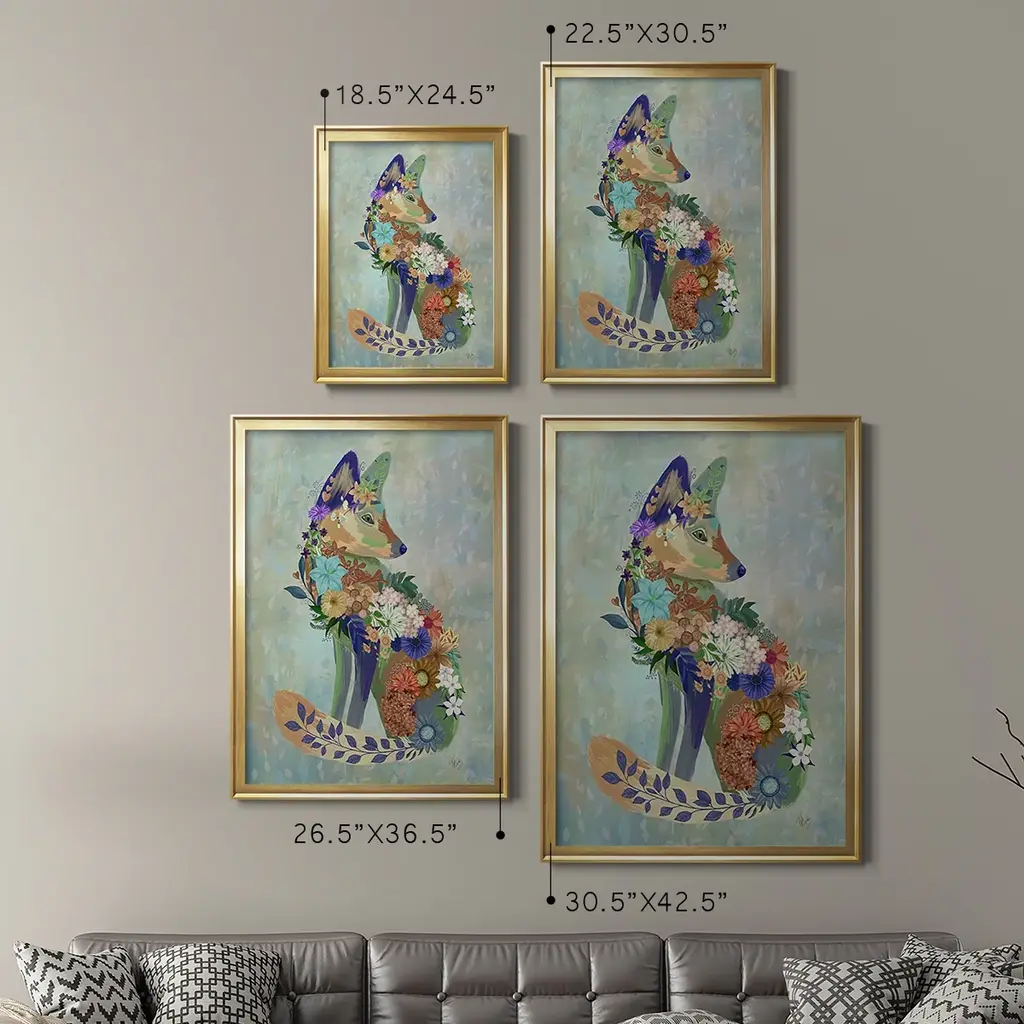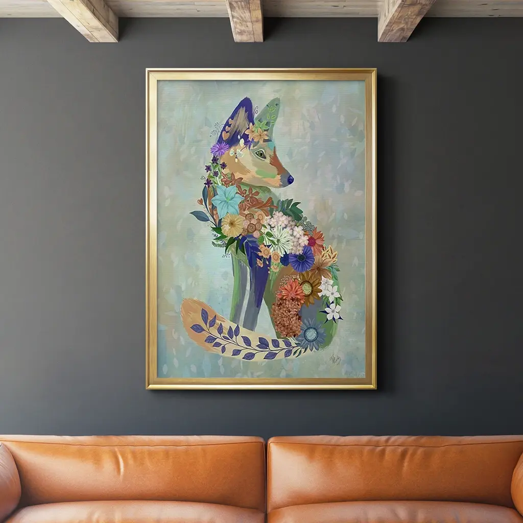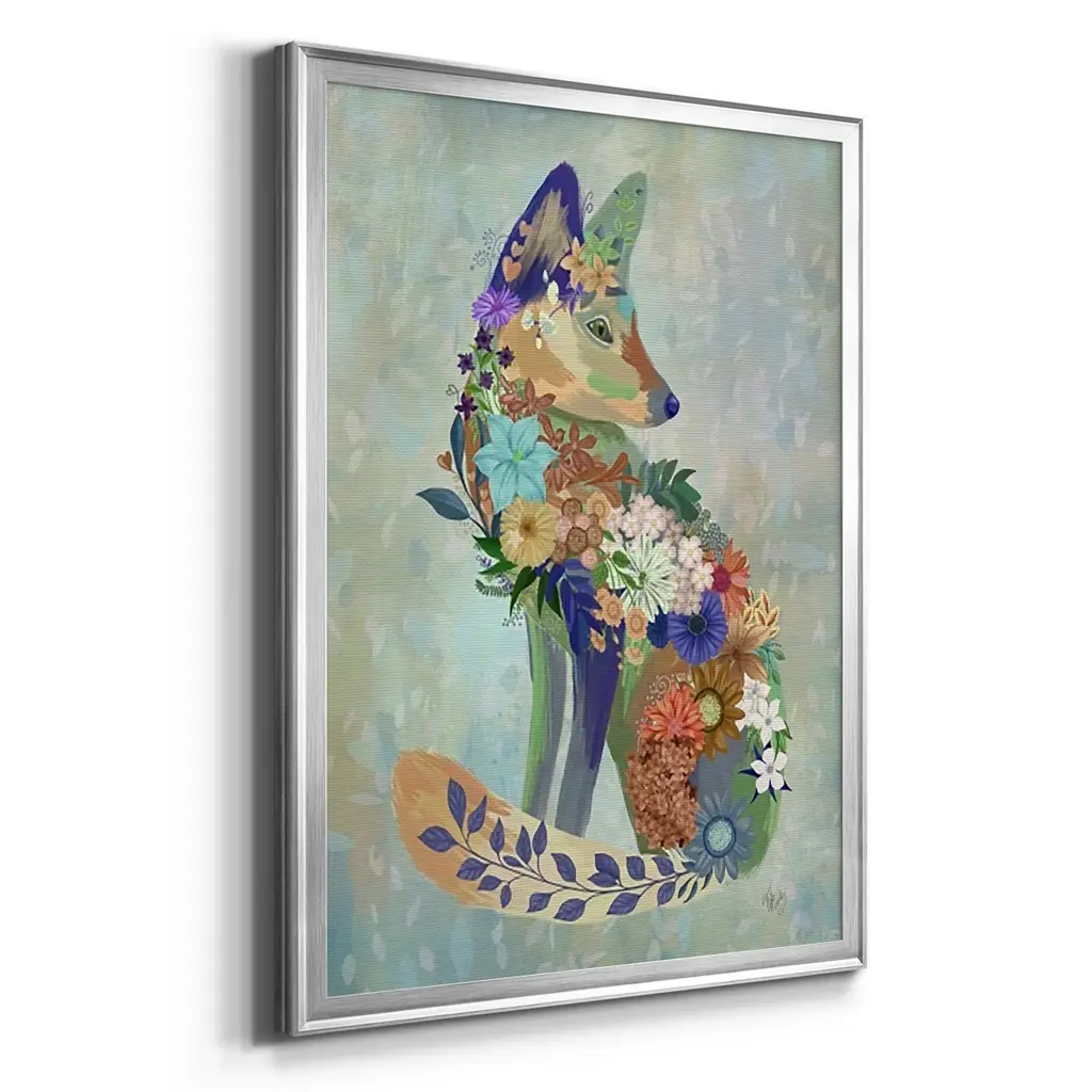 Fantastic Florals Fox, Sitting Premium Framed Print - Ready to Hang A Premium Framed Print created to last. Framed in distressed wood and available in an array of sizes and colors Featuring a beveled a solid wood stretcher bar, each piece comes ready to hand 4 SIZES AVAILABLE 30.5''X42.5'' - Overall Size 26.5'X36.5'' - Overall Size 22.5''x30.5'' - Overall Size 18.5''x24.5'' - Overall Size Each piece is made to order. Each piece comes with hanging hardware. Made in the USA Ready to Hang