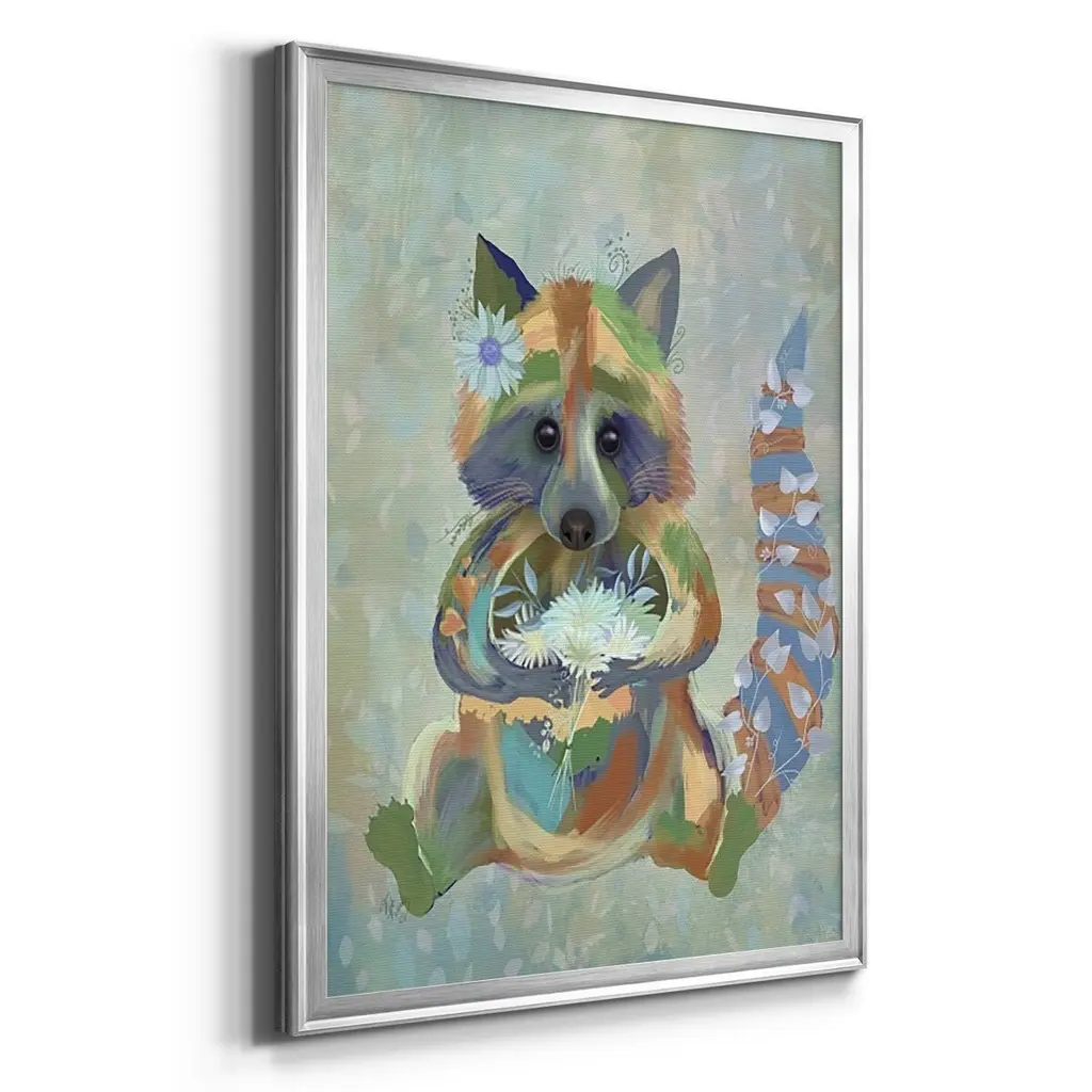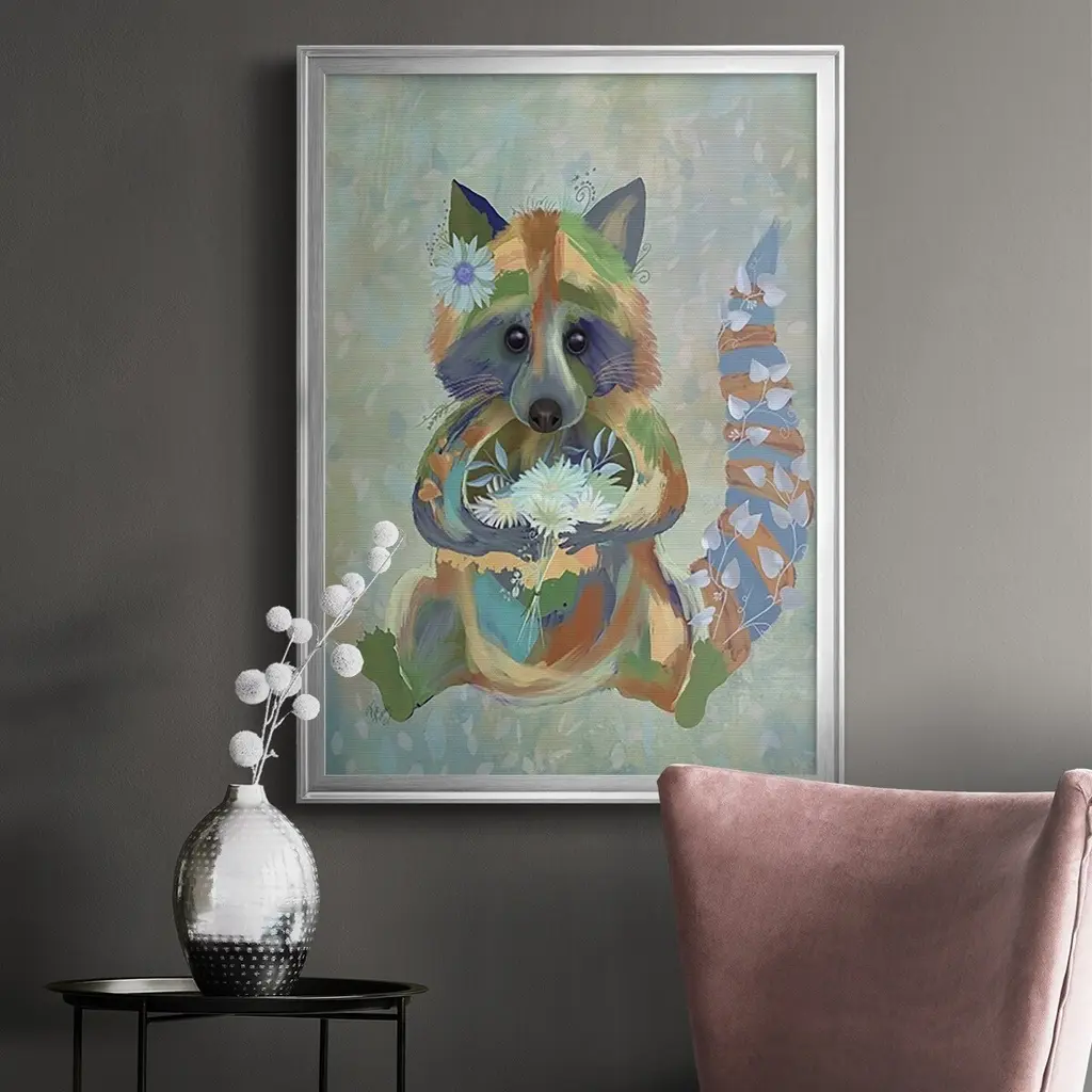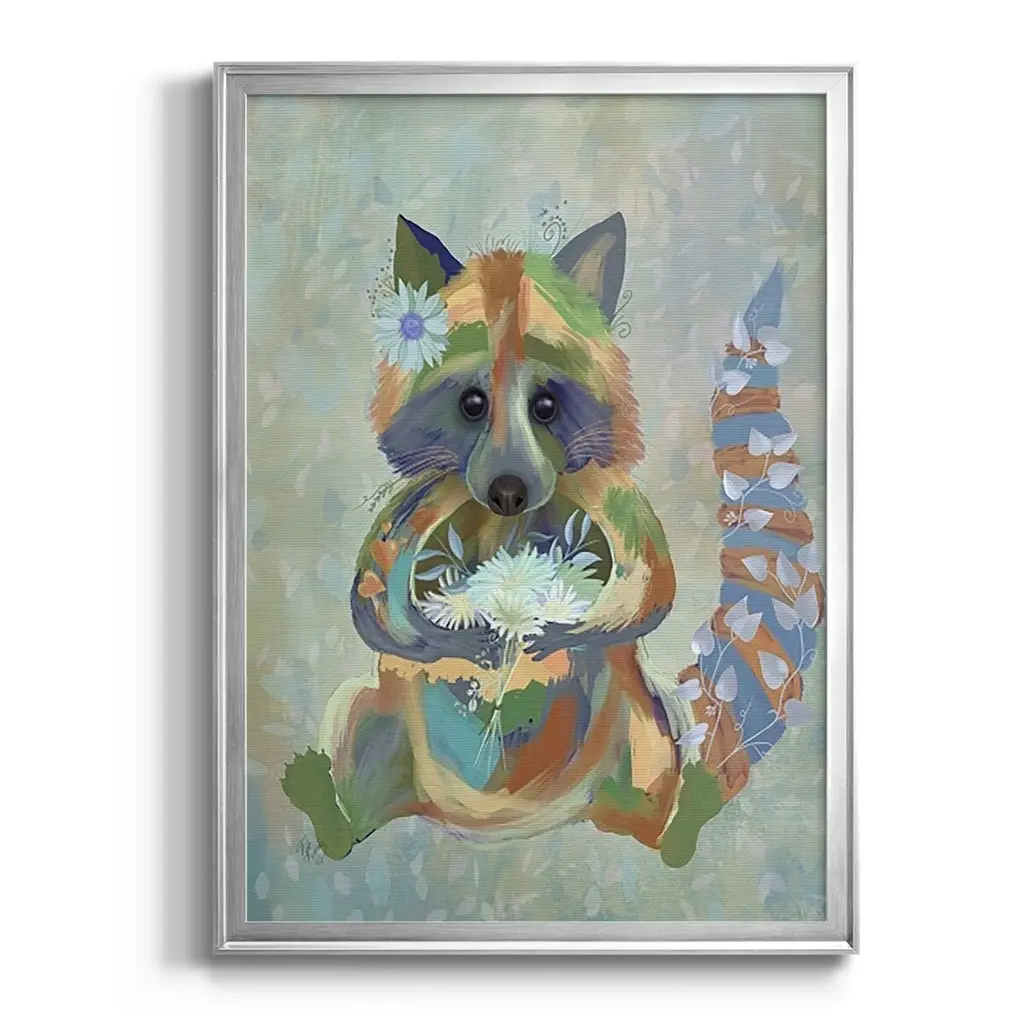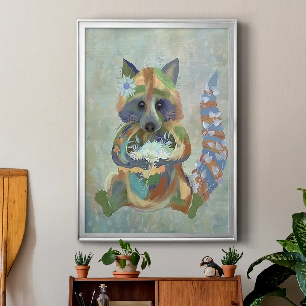 Fantastic Florals Raccoon Premium Framed Print - Ready to Hang A Premium Framed Print created to last. Framed in distressed wood and available in an array of sizes and colors Featuring a beveled a solid wood stretcher bar, each piece comes ready to hand 4 SIZES AVAILABLE 30.5''X42.5'' - Overall Size 26.5'X36.5'' - Overall Size 22.5''x30.5'' - Overall Size 18.5''x24.5'' - Overall Size Each piece is made to order. Each piece comes with hanging hardware. Made in the USA Ready to Hang