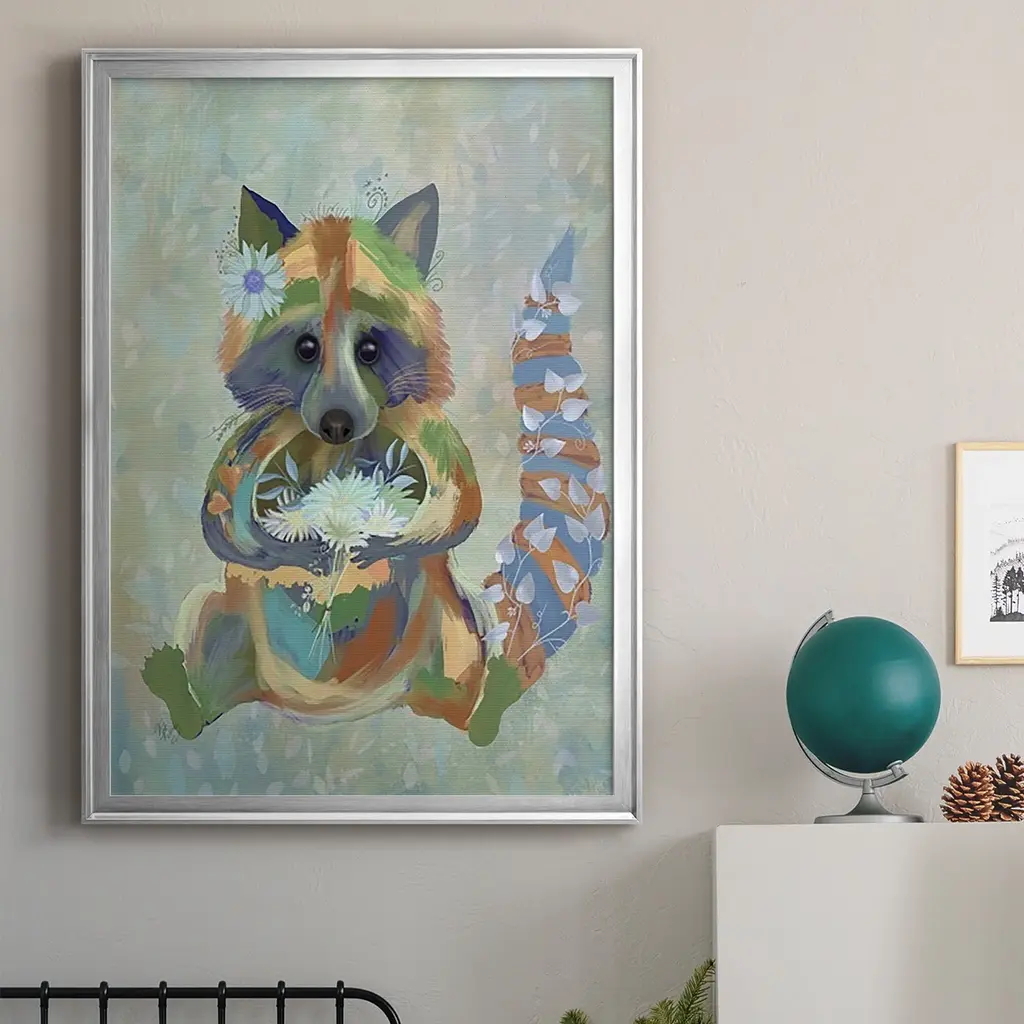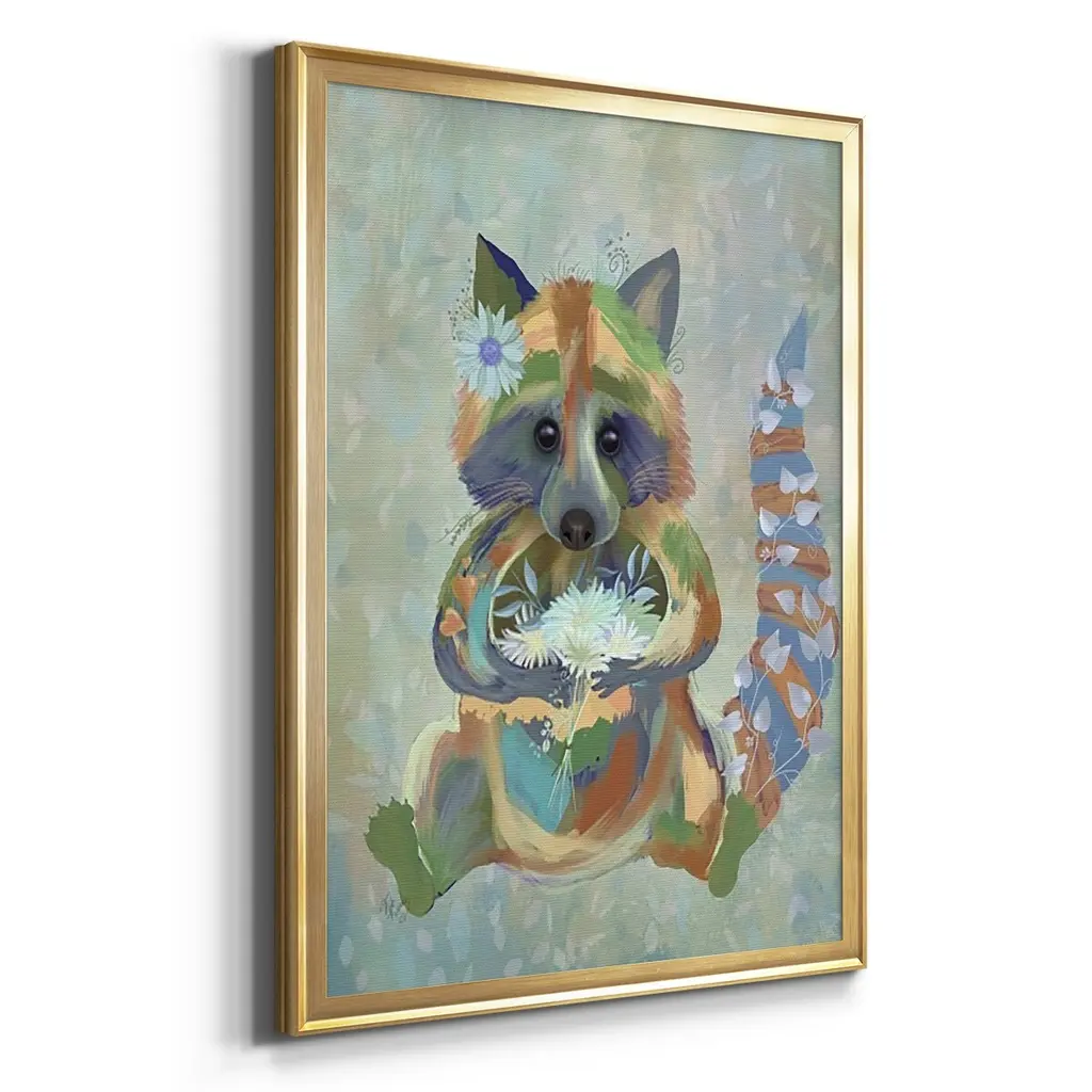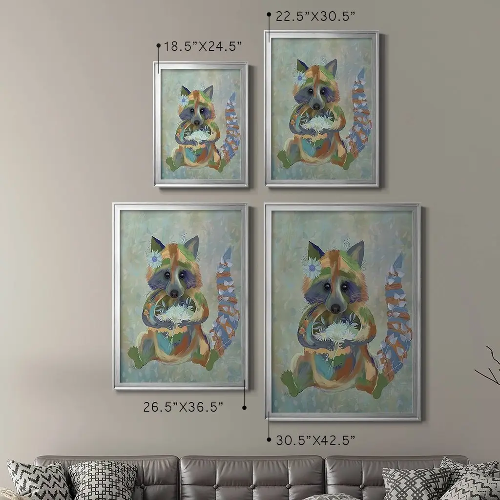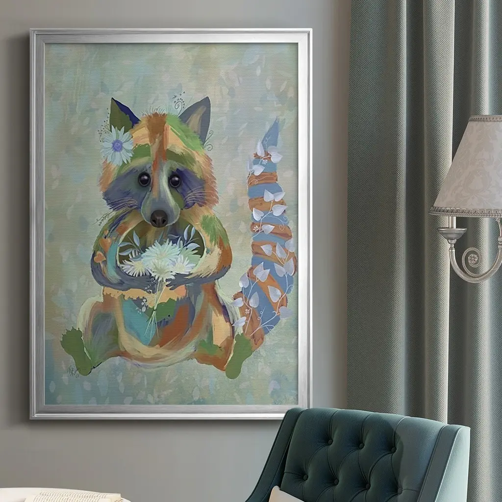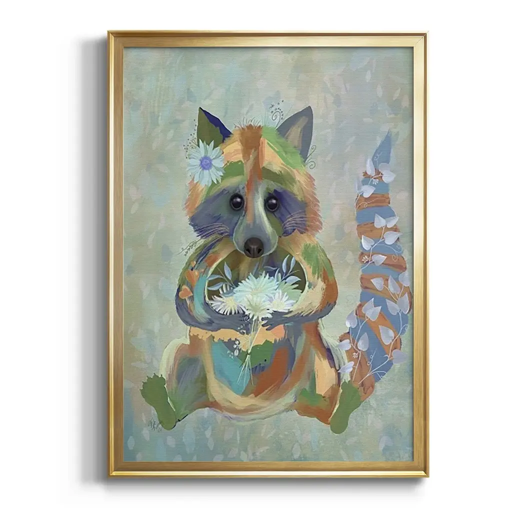 Fantastic Florals Raccoon Premium Framed Print - Ready to Hang A Premium Framed Print created to last. Framed in distressed wood and available in an array of sizes and colors Featuring a beveled a solid wood stretcher bar, each piece comes ready to hand 4 SIZES AVAILABLE 30.5''X42.5'' - Overall Size 26.5'X36.5'' - Overall Size 22.5''x30.5'' - Overall Size 18.5''x24.5'' - Overall Size Each piece is made to order. Each piece comes with hanging hardware. Made in the USA Ready to Hang