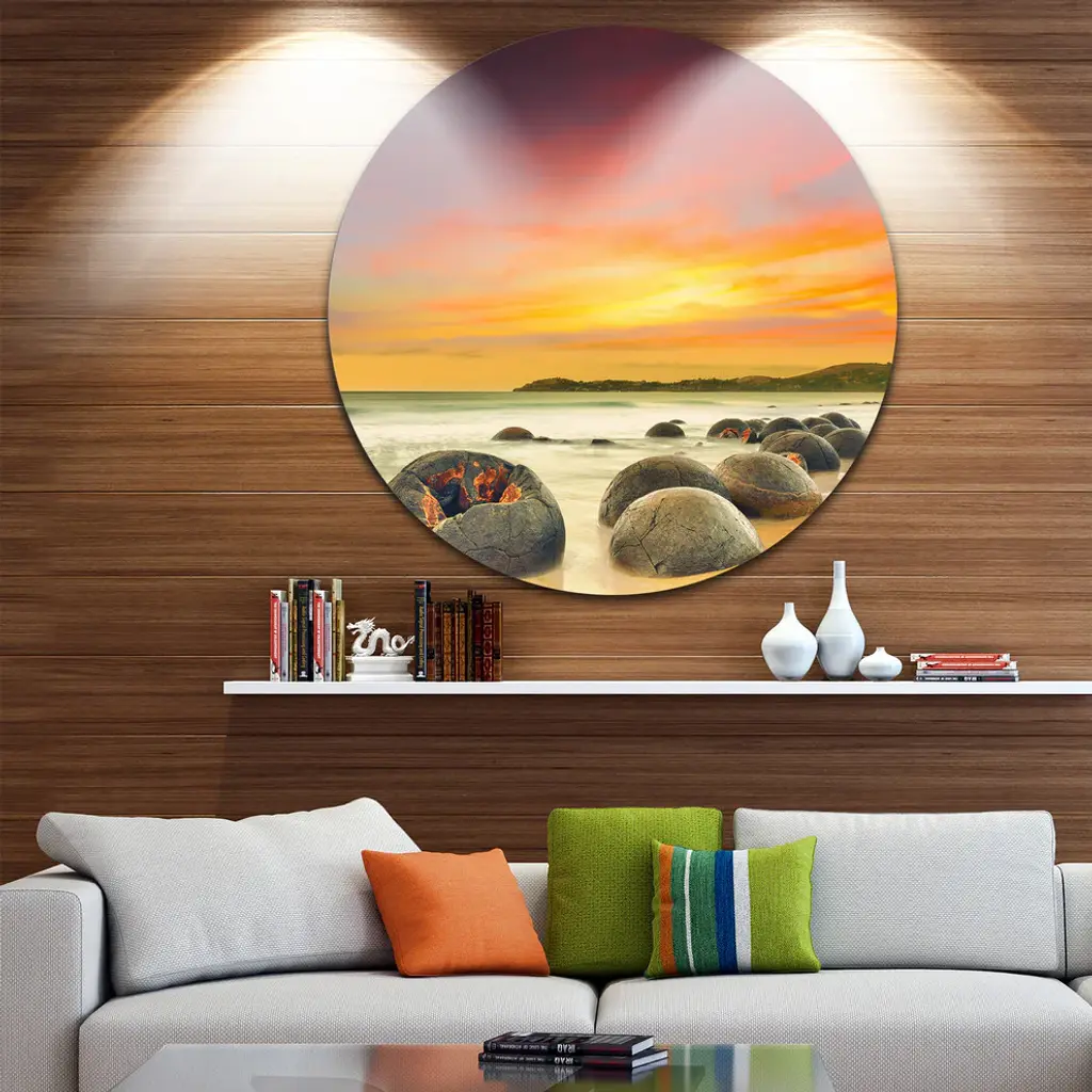 Bring Contemporary Abstraction to your home with this large Circle Metal wall art. This Fantastic Moeraki Boulders View at Sunset Metal Artwork makes it the focal point of any room or office. - White Gloss Coating ensures colors are extra vibrant with light reflection.- Aluminum grade Sheet Metal with 1 inch mounting frame on the back giving the illusion that the artwork is floating on the wall..- Mounting Brackets are included along with instructions.- High Quality Digital images are created directly into a glossy aluminum panel producing a stunning and captivating print into the glossy finish of the metal.- Water, Fire and Scratch resistant HD Aluminum panels.- Looks better than any photo paper and guaranteed to last at least 20 years- Easy to clean with a microfiber cloth. Colors are far superior to regular Canvas Art. - Easy to Hang