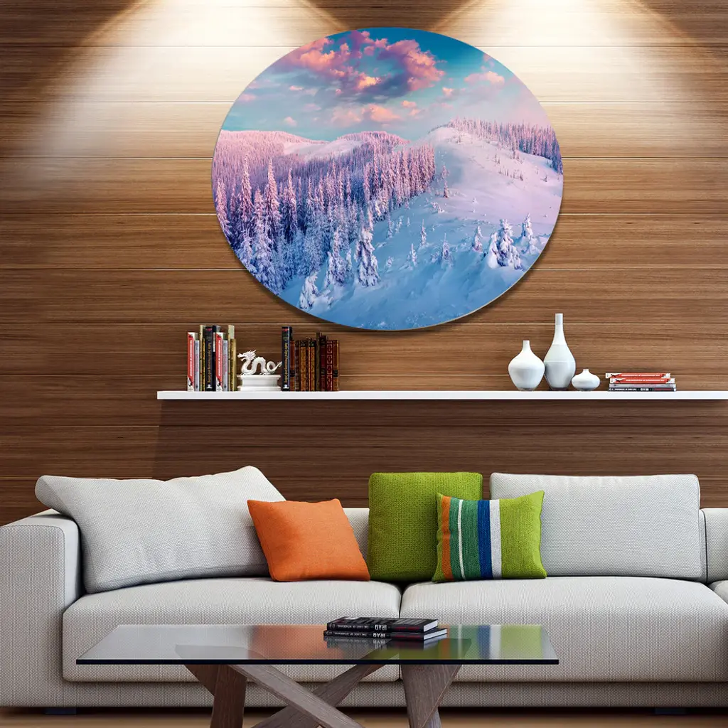 Bring Contemporary Abstraction to your home with this large Circle Metal wall art. This Fantastic Sunrise over the Carpathians Metal Artwork makes it the focal point of any room or office. - White Gloss Coating ensures colors are extra vibrant with light reflection.- Aluminum grade Sheet Metal with 1 inch mounting frame on the back giving the illusion that the artwork is floating on the wall..- Mounting Brackets are included along with instructions.- High Quality Digital images are created directly into a glossy aluminum panel producing a stunning and captivating print into the glossy finish of the metal.- Water, Fire and Scratch resistant HD Aluminum panels.- Looks better than any photo paper and guaranteed to last at least 20 years- Easy to clean with a microfiber cloth. Colors are far superior to regular Canvas Art. - Easy to Hang