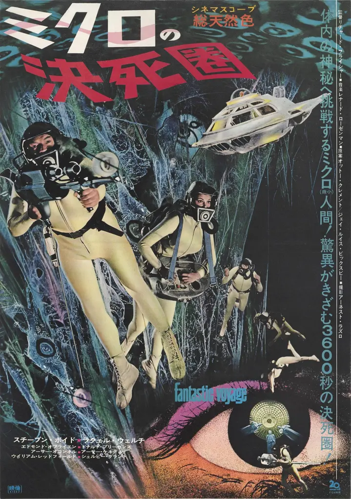 Original Japanese film poster for the 1966 science fiction film directed by Richard Fleischer, and starring Stephen Boyd and Raquel Welch. The fabulous artwork is unique to the Japanese poster.This poster is conservation linen backed and it would be shipped rolled in a very strong tube.