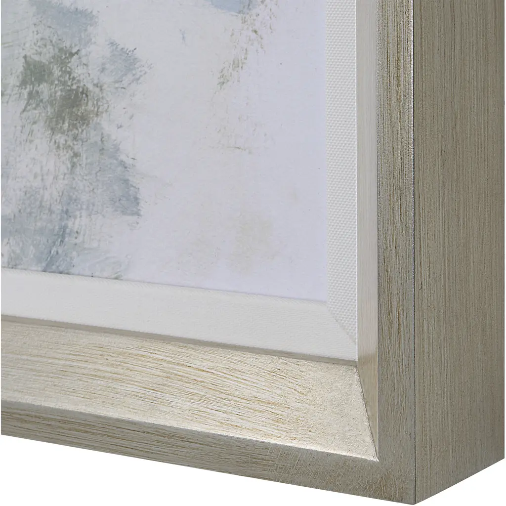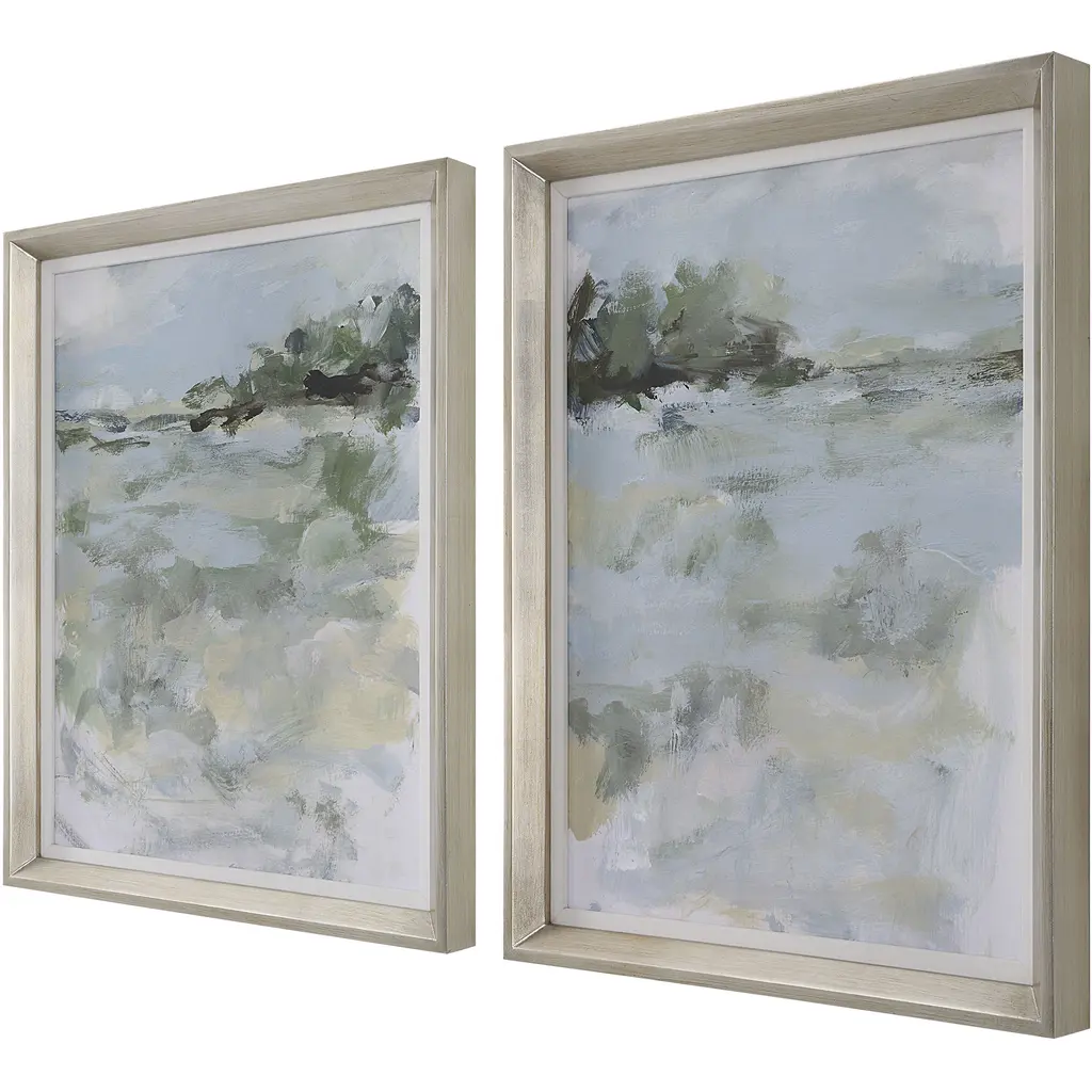 This Petite Diptych Displays An Abstract Landscape In Cool Powder Blue And Forest Green Tones. Each Print Is Complemented By A Delicate White Linen Liner And A Brushed Champagne Silver Frame. Artwork By Christina Long.